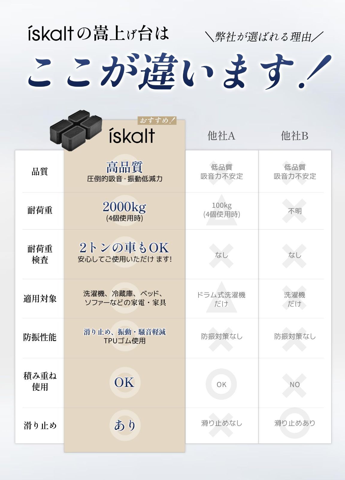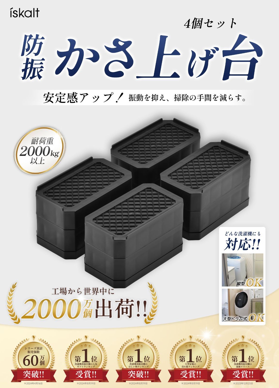 ISKALT 洗濯機用防振かさ上げ台 高さ調節 洗濯機・乾燥機・冷蔵庫用置き台 取り外し可能 家具に傷防止 滑り止め 床に傷防止 耐荷重約2000kg 異音吸収 振動吸収 テーブルの角を守る 自由につなぎ合わせる 1セット4個入り 据付脚IST001 2-WH
