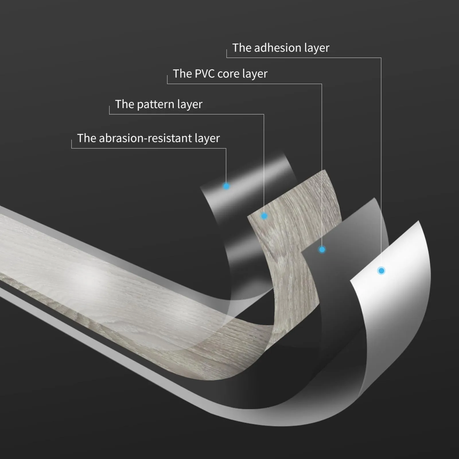 リアルな木目質感 :フロアタイルの表面はエンボス加工されており、本物の木目に見間違うほどのリアルな質感を再現しています。さらりとした手触りで、表面には耐摩耗加工が施されているため、キズがつきにくい設計です。また、防水・防火 効果もあり、土足でも素足でも快適にご使用いただけます