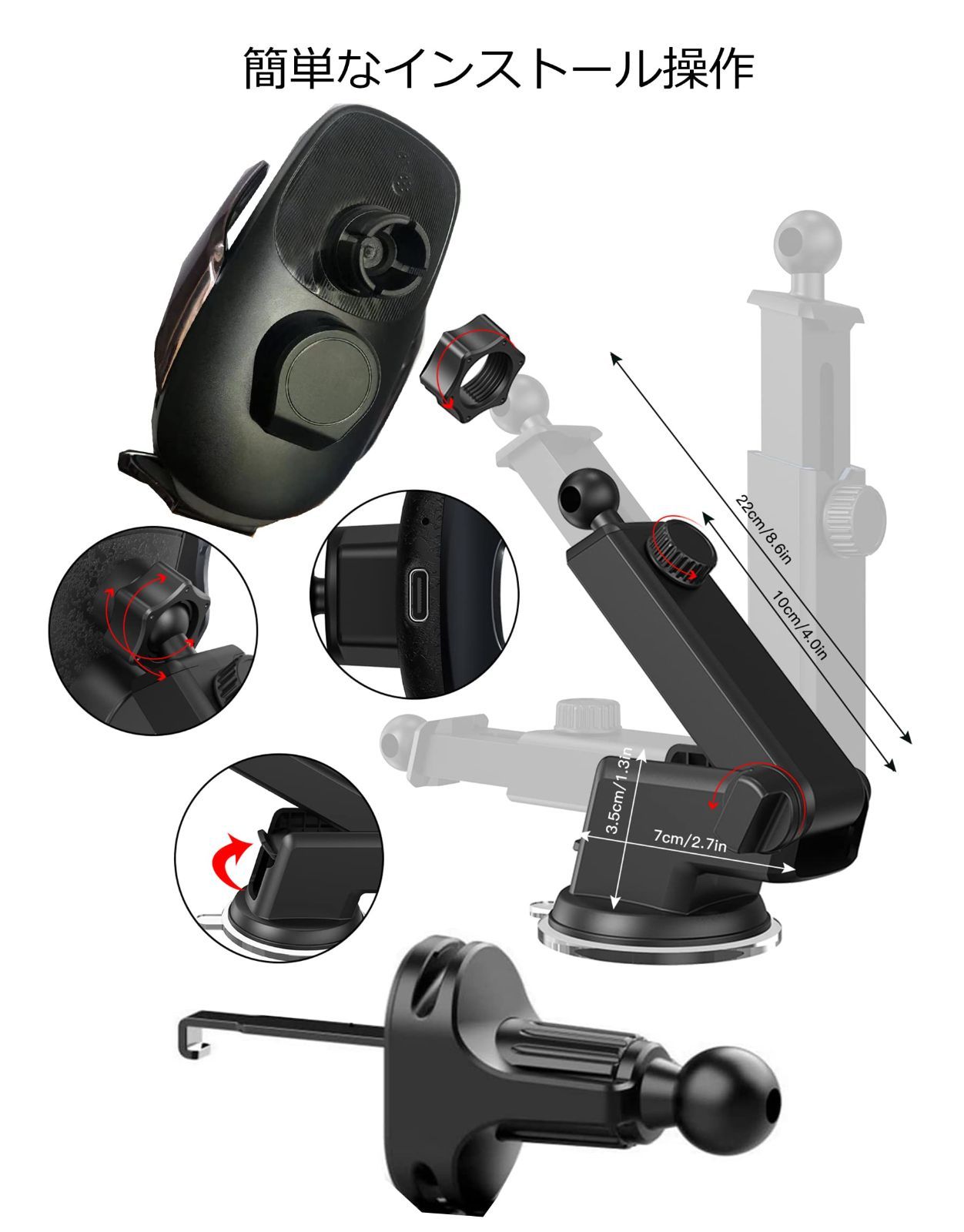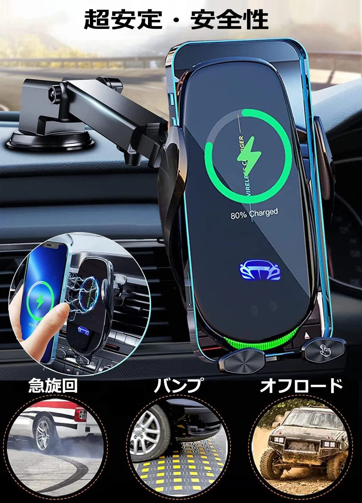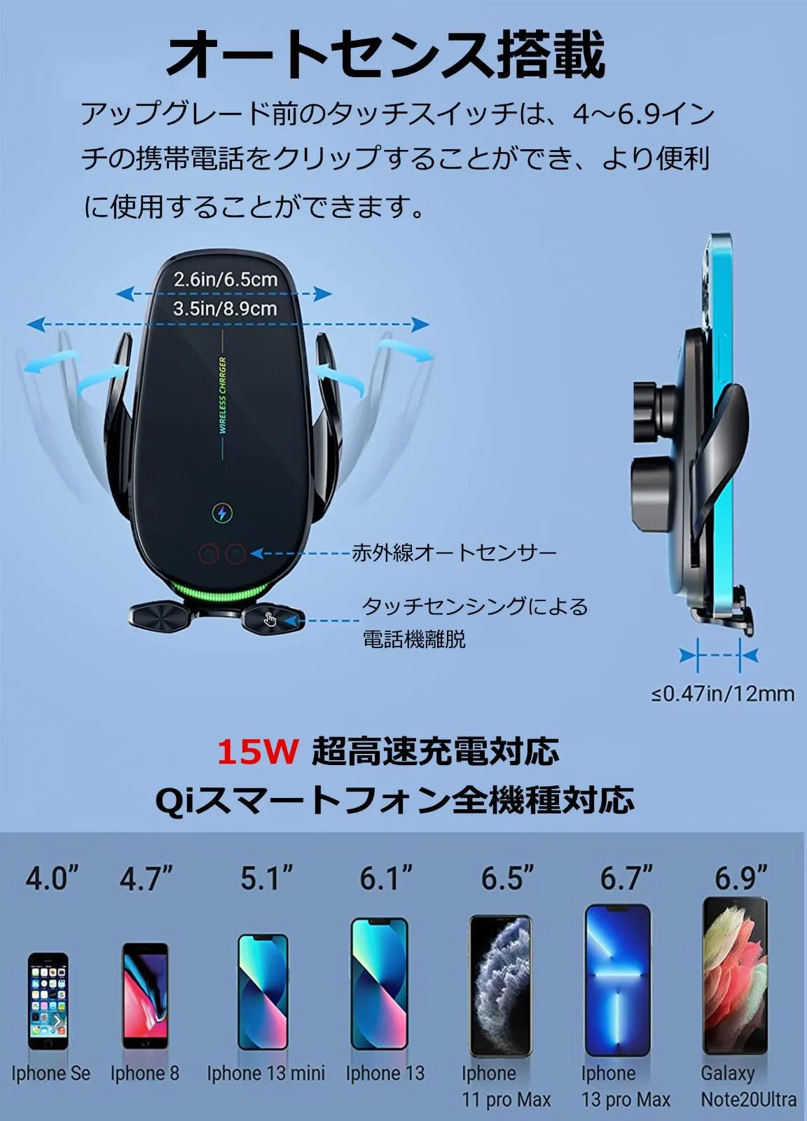 取り外す不要で充電のできる:この車載用スマホホルダーワイヤレス充電器は、厚さ8mmまでのスマホケースに対応できます。ご注意:金属や磁気を帯びたもの、クレジットカード、カートリッジクリップなどを取り除き、8mm以上のケースは充電効率が低下します。