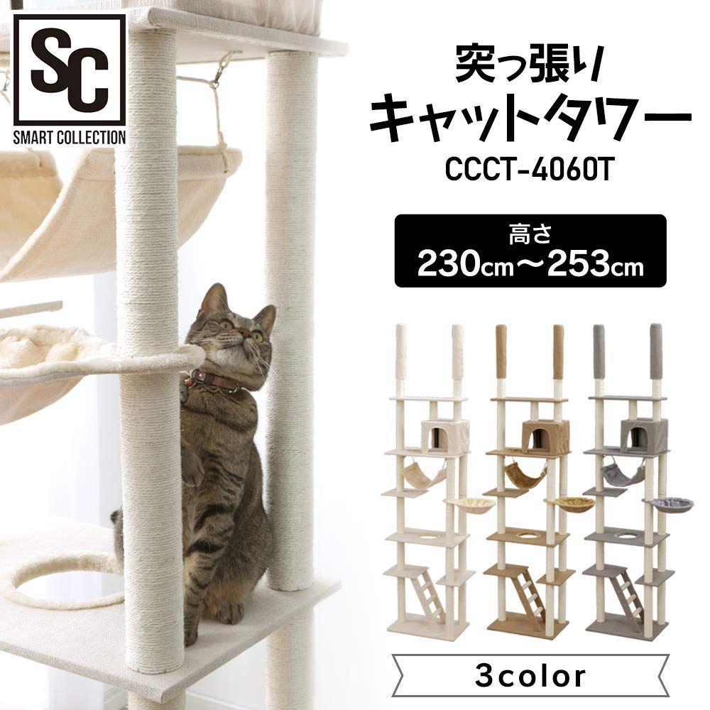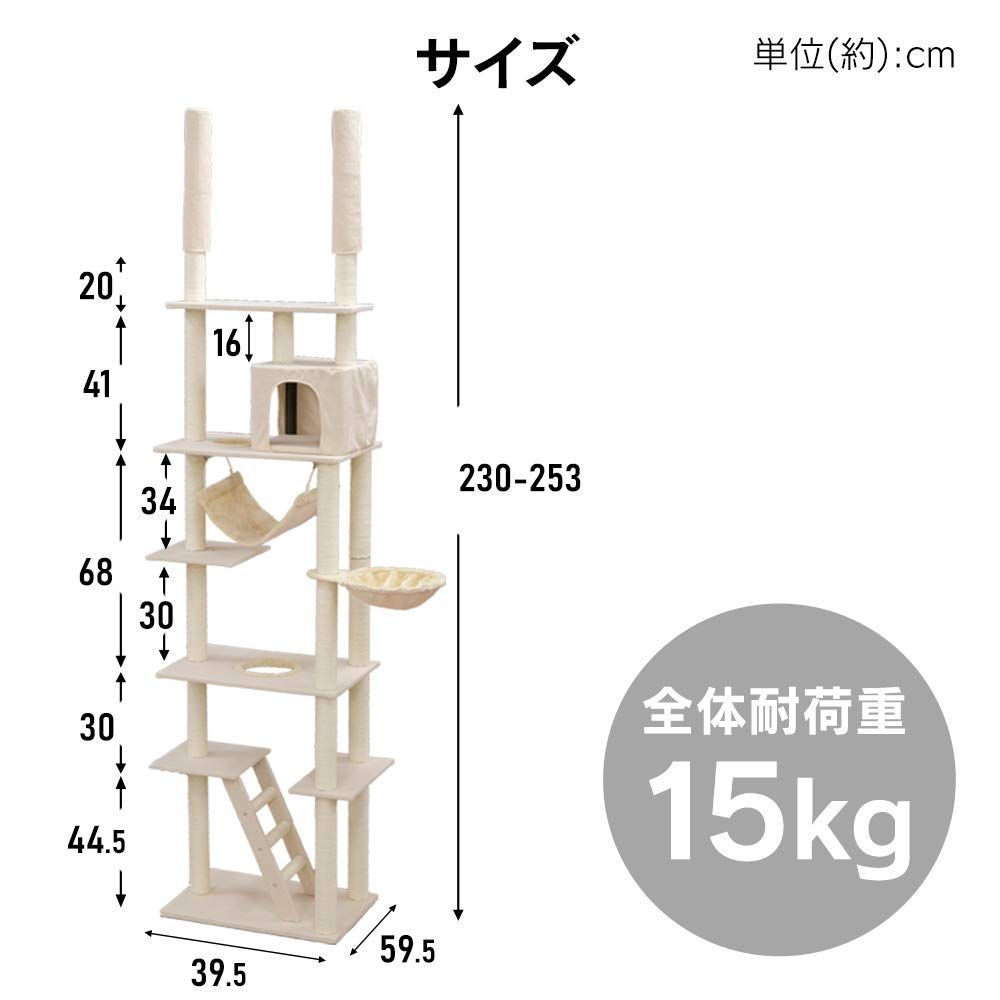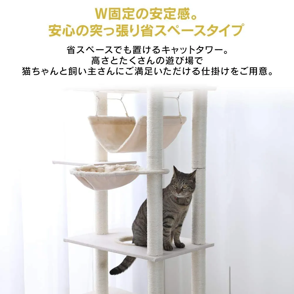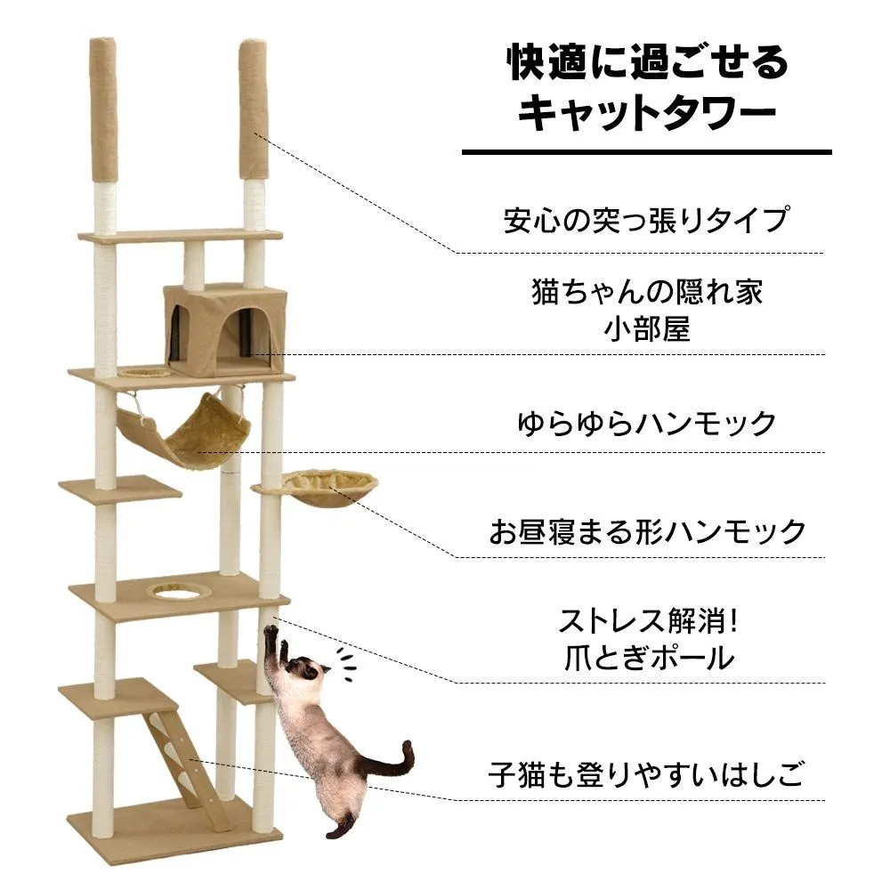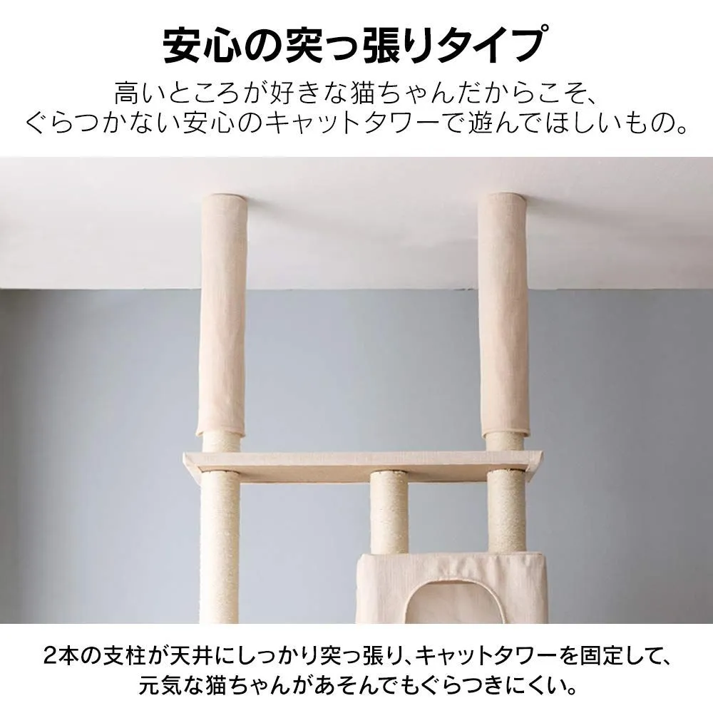 アイリスプラザ キャットタワー 突っ張り W固定 厚底 安定感 頑丈 ハンモック おうち つめとぎ付き ベージュ 高さ220-252cm