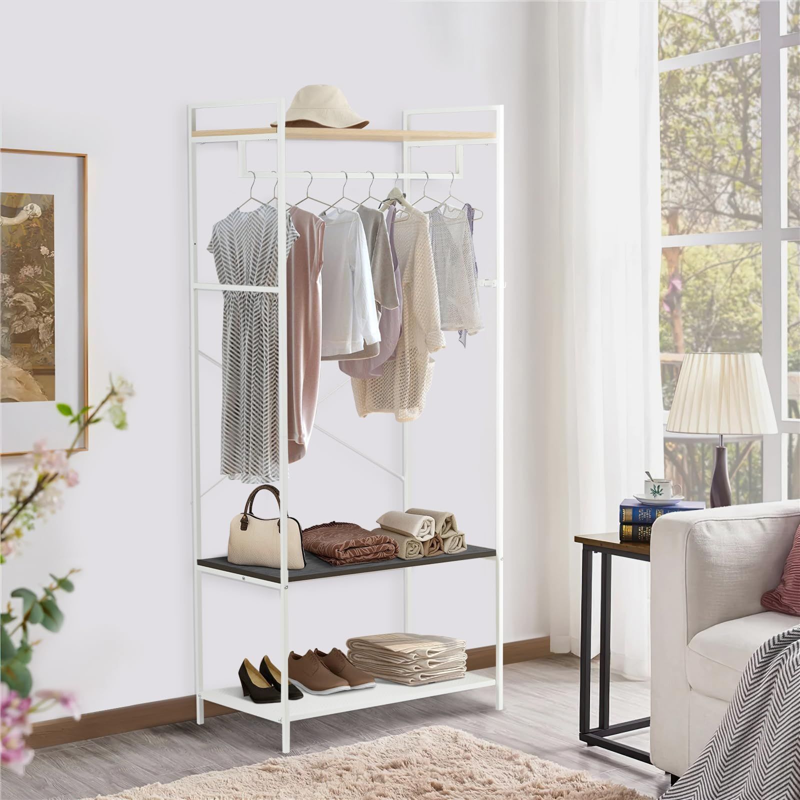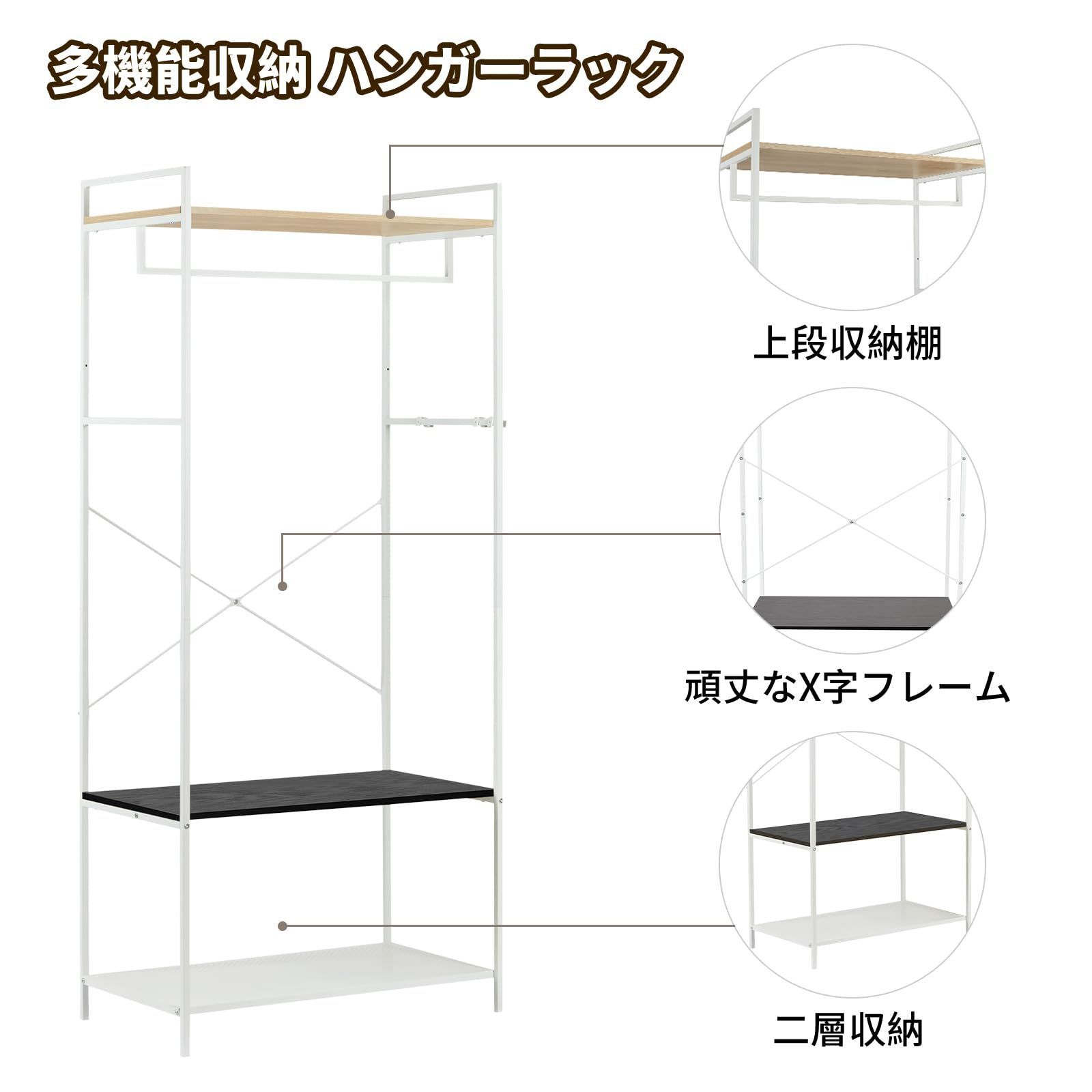 【大容量ラック】このハンガーラックの上部は、帽子やボックスの収納スペースとして使用できます。さらに、ほこりから衣類をまもります。下部にも広めの棚板が2枚あります。タオル・靴などの収納はもちろん、便利にお使いいただけます。