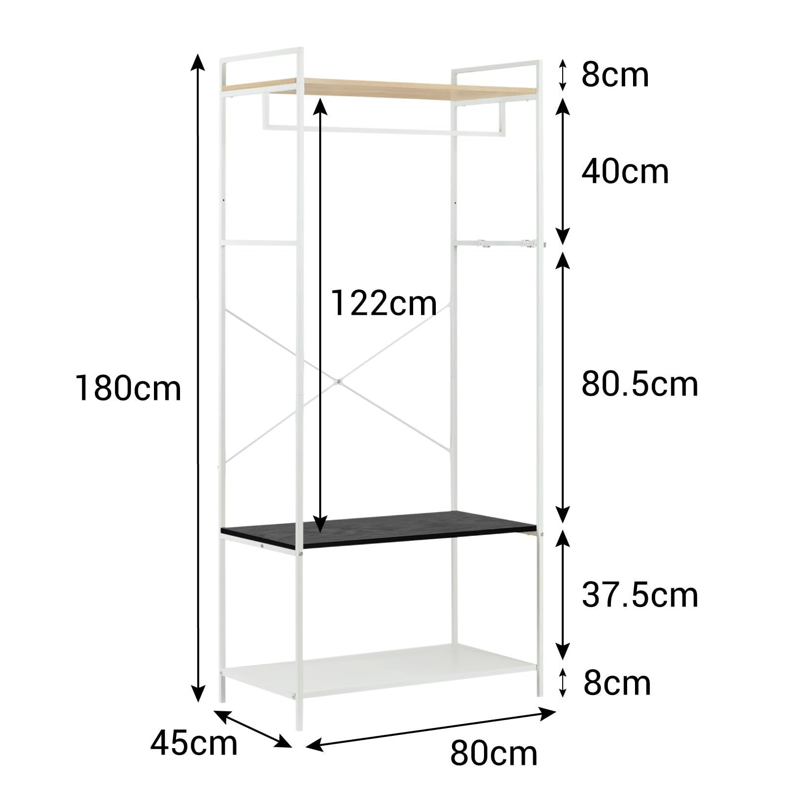 【商品情報】コートハンガーのサイズ:幅80×奥行45×高さ180cm、重量14kg。スリムなデザインで、狭いお部屋でもスペースを有効活用し、靴、帽子、衣類などを整理整頓します。
