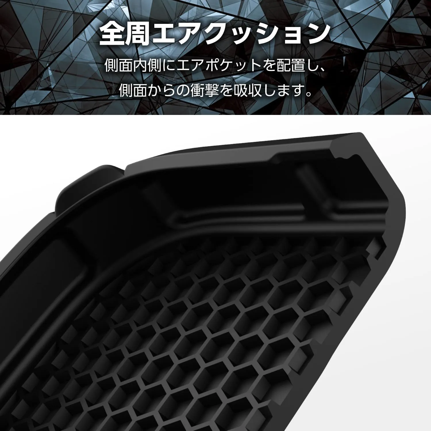 端末の背面が接するケース内側にも、衝撃吸収効率の高いハニカム構造を採用しています。