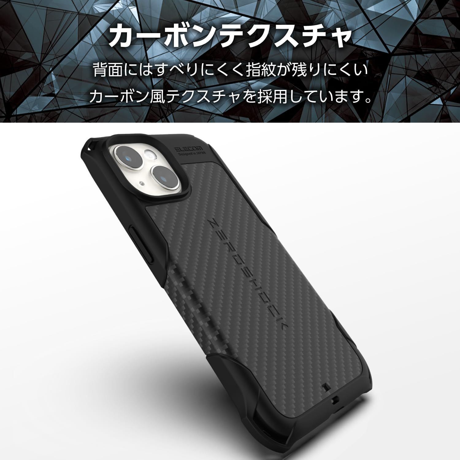 ケース背面から側面にかけてカーボン調のグリップテクスチャーを施すことで、滑りにくくし持ちやすさを向上しています。