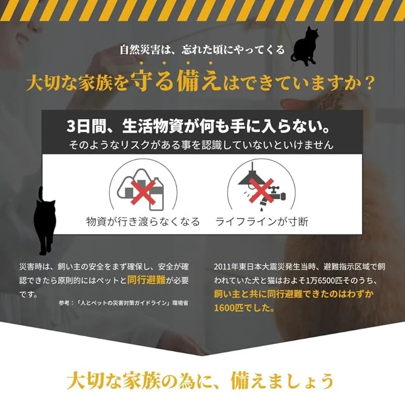 【商品説明】 大切なペットを災害から守る防災グッズをお探しですか?「緊急避にゃん」は猫ちゃんを連れて避難をする際に役立つアイテムが揃った非常用持ち出し袋です。各地の震災など、災害支援でボランティア活動を行った経験から生まれた実用性の高いセレクトです。 専門ガイドブック付きで、初心者でも迷わないよう避難の準備を完全サポート。 ・避難所で猫ちゃんと安心して過ごせるか心配。 ・周囲に迷惑をかけずに過ごすにはどうしたらいいの? そんな不安を解決するために、事前に備えを済ませておくお手伝いがしたい。 そして誕生したのが「猫用防災基本セット 緊急避にゃん!」です。