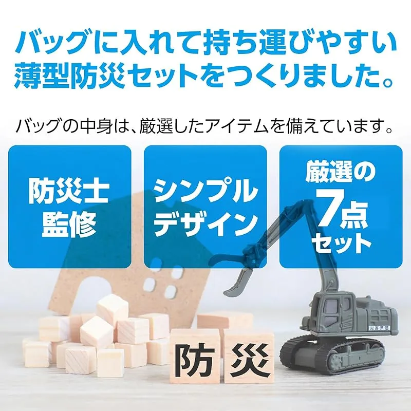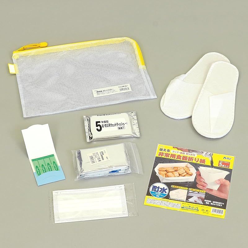 【セット内容】連絡袋×1、ばんそうこう(2枚)×1、非常用食器折り紙×1、不織布マスク×1、非常用アルミ防寒寝袋×1、不織布スリッパ×1組、防災用ウェットティッシュ×1