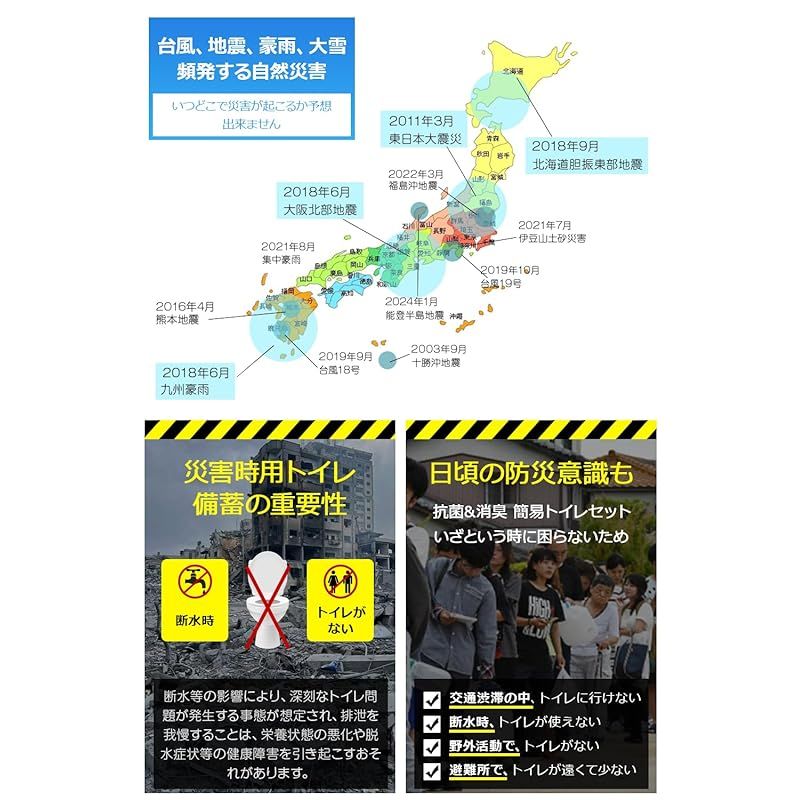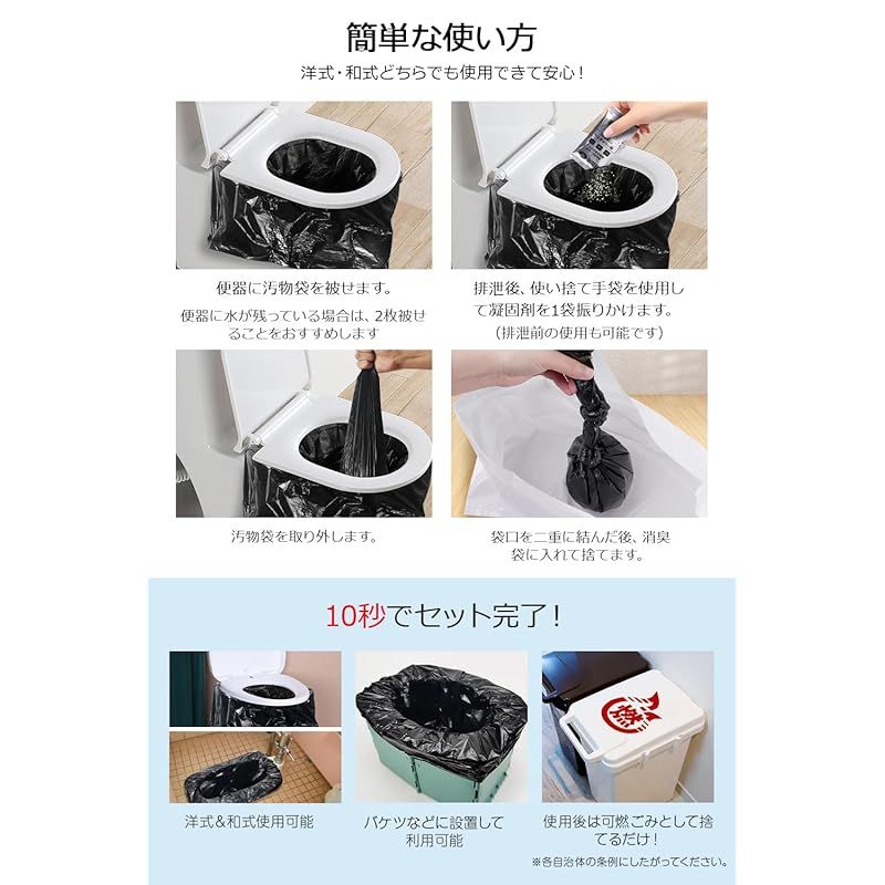 【商品説明】 汚物袋、凝固剤、使い捨て手袋、防臭袋まで揃ったオールインワン仕様の携帯トイレで、すぐに使えて片付けも簡単。停電・断水・在宅避難・車中泊・介護など、どんな状況でも衛生的な“簡易トイレ環境”をつくれます。