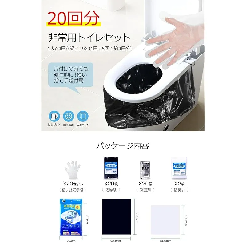【必要なものすべてセット!初めてでも迷わず使える安心構成】1箱セット内容:汚物袋×20、防臭袋×2、凝固剤×20、使い捨て手袋×20セット、説明書×1。初めての方でも “すぐ使える携帯トイレセット” として作られており、万が一の不具合時には購入履歴よりすぐにサポート対応いたします。