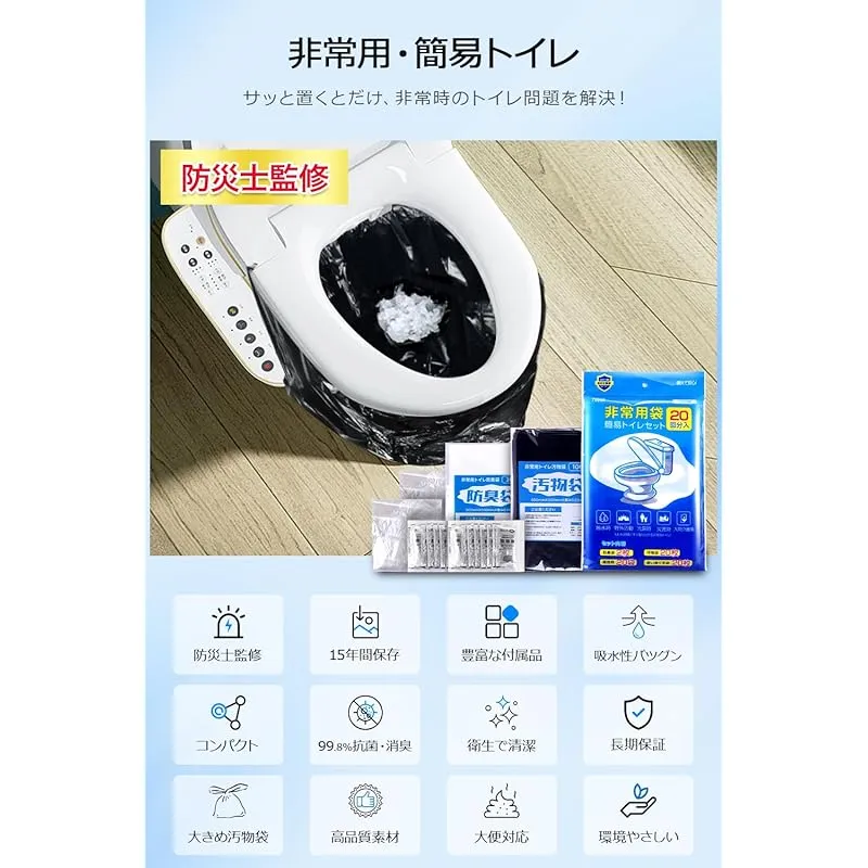 【新品】 【防災士監修】 簡易トイレ 携帯トイレ 非常用 簡単 災害用 防災トイレ ポータブル 20~100回分 防臭袋 大便 強力消臭 アウトドア 介護用/台風/洪水/災害時/断水時 15年保存 (1セット(20回)) 0