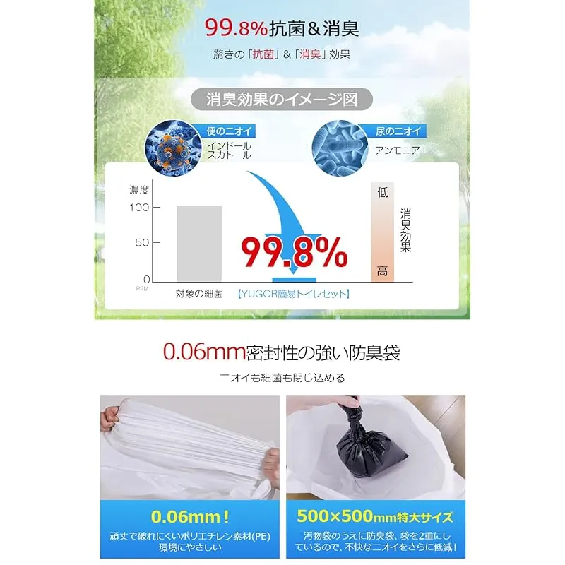 【特大650×500mmの汚物袋×強力防臭袋で安心のダブルブロック】家庭の洋式トイレにぴったりフィットする特大サイズの汚物袋(650×500mm/厚さ0.03mm)を採用。二重しばりができ、強度が高く破れにくいPO素材で安心。さらに、高密封PE防臭袋(500×500mm/厚さ0.06mm)がニオイと菌をしっかり閉じ込め、避難所や車内でも快適に使える“におい対策簡易トイレ”を実現。