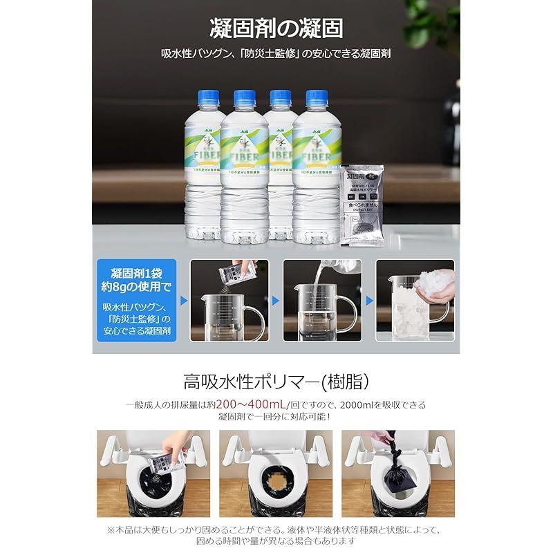 【2000mlを瞬時に固める強力凝固!高吸水性ポリマー採用】1袋(8g)に高吸水性ポリマーをたっぷり配合。水分から排泄物まで瞬時にジェル化し、逆戻りしないため、災害時の簡易トイレとして抜群の使いやすさ。細菌の増殖を抑えながら、気になるニオイも強力カット。“におわない非常用トイレ”を求める方に最適です。