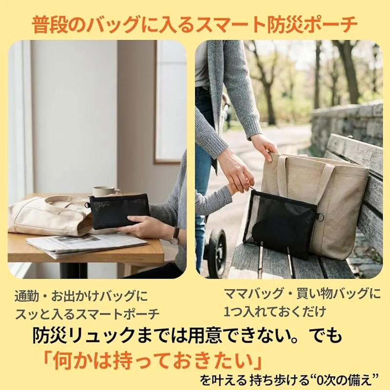 【商品説明】 「いつも」と「もしも」に、これひとつ。 防災セットは、玄関に置いておくだけのものではありません。 本当に困る瞬間は、外出先での「渋滞」や「列車の遅延」、あるいは「突然の災害」かもしれません。 防災士である店長が、そんな外出先での不安を解消するために開発したのが、この「スマート防災ポーチ」です。