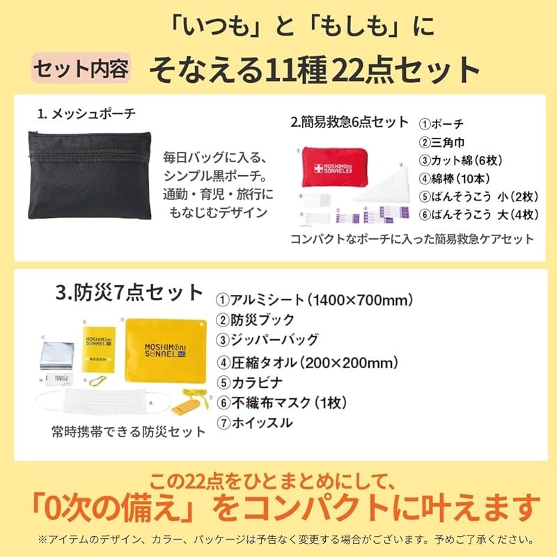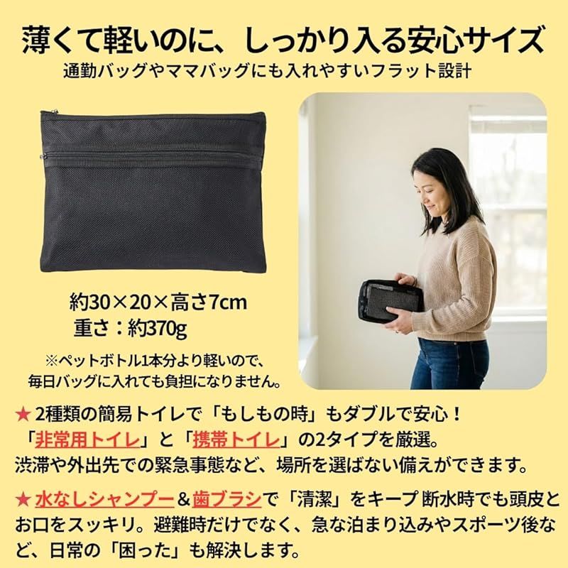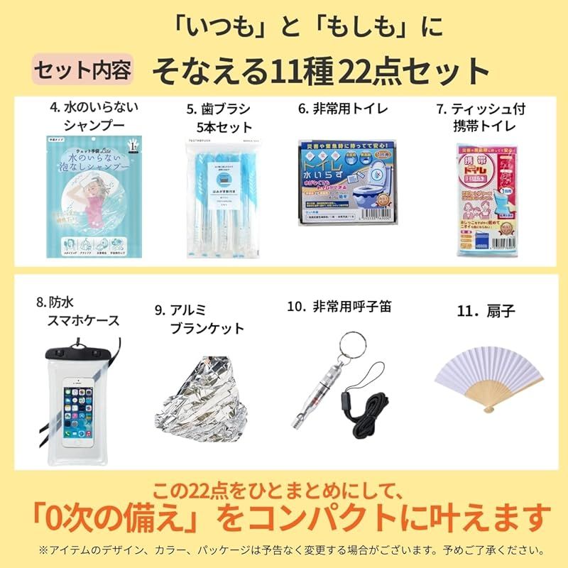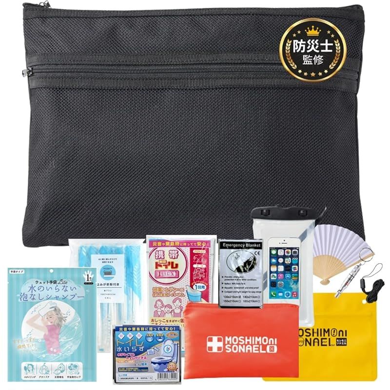 ●セット内容一覧: 1.メッシュポーチ(黒) [1点] 2.衛生・ケア:水のいらないシャンプー、歯ブラシ(5本入)、不織布マスク、圧縮タオル、 [計4点] 3.トイレ対策:非常用トイレ、携帯トイレ(ティッシュ付) [計2点] 4.救急セット:赤ポーチ、カット綿(6枚)、絆創膏(大4枚/小2枚)、綿棒(10本)、三角巾 [計6点] 5.環境対策:アルミブランケット、扇子 [計2点] 6.安全・情報:呼子笛、ホイッスル、防災ブック、カラビナ、スマホケース、ジッパーバッグ 、防災ブック[計7点]
