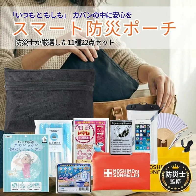 【新品】 スマート防災ポーチ 【防災士監修 11種 22点セット】 持ち歩き 防災セット 1人用 コンパクト 女性 子ども 携帯トイレ 避難グッズ 停電 渋滞 登山 外出 SAFETY24