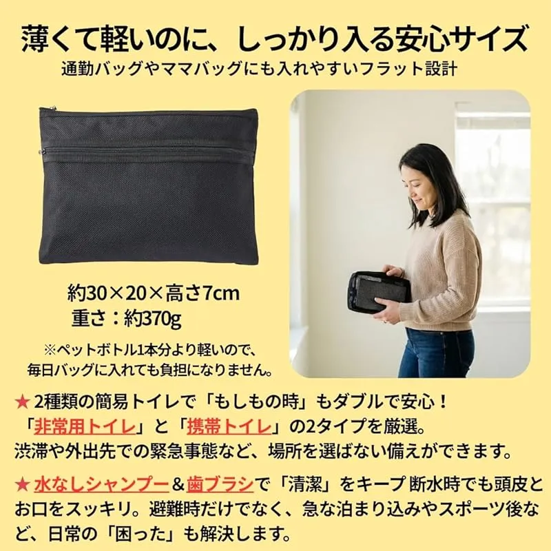 【外出先での緊急トイレ対策】 「非常用トイレ」と「携帯トイレ」の2タイプを同梱。道路の渋滞、列車の突然の立ち往生、外出先での急な尿意など、あらゆる場面での「トイレ問題」からあなたを守ります。