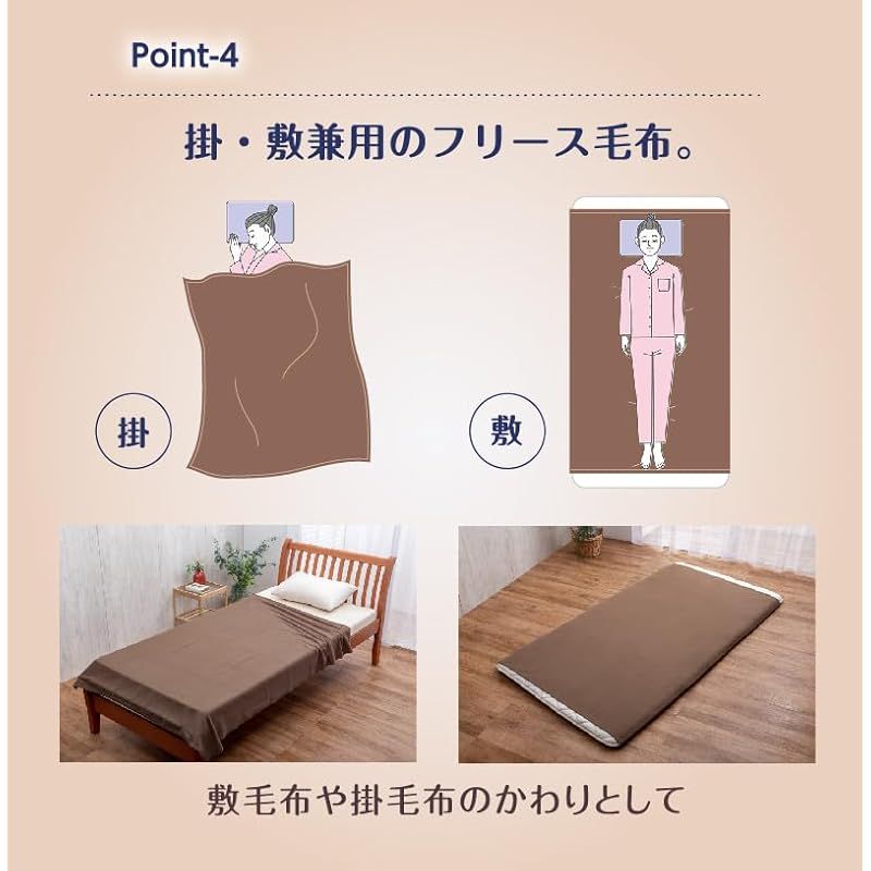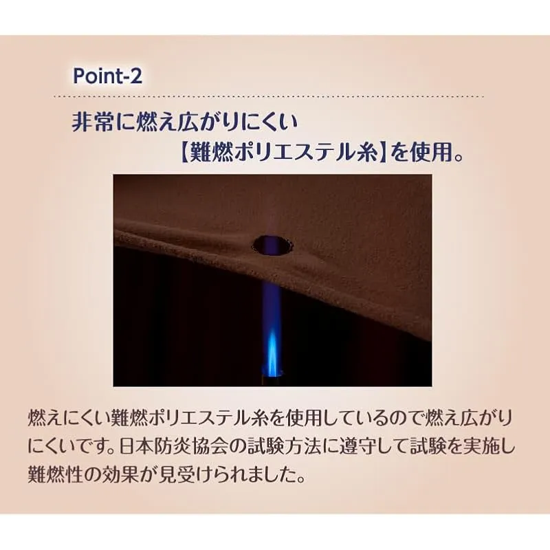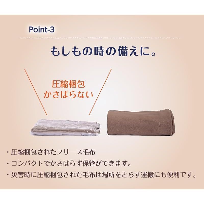 【難燃ポリエステル糸】を使用。-燃えにくい難燃ポリエステル糸を使用しているので燃え広がりにくいです。日本防炎協会の試験方法に遵守して試験を実験し難燃性の効果が見受けられました。ポイント3:もしもの時の備えに。-圧縮梱包されたフリース毛布なので、コンパクトでかさばらず保管できます。災害時に圧縮梱包された毛布は場所を取らず、運搬にも便利です。ポイント4:掛け・敷き兼用のフリース毛布。掛け毛布・敷き毛布の代わりに使用できます。ポイント5:こんなシーンにオススメ。燃えにくい素材を活かして、オフィス・学校・ご家庭やアウトドアでの使用におすすめです。寒い日のキャンプやバーベキュー、災害用の備えとしてなど多くのシーンで活躍します。