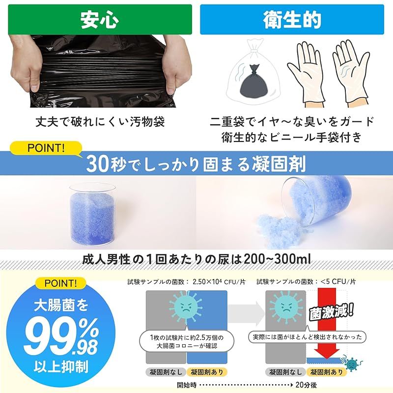【高い吸水量】凝固剤の量は10gと多く、1回の使用であれば十分に吸収できます。凝固剤を入れてから30秒程度で糞尿をしっかりと固められるので安心です。