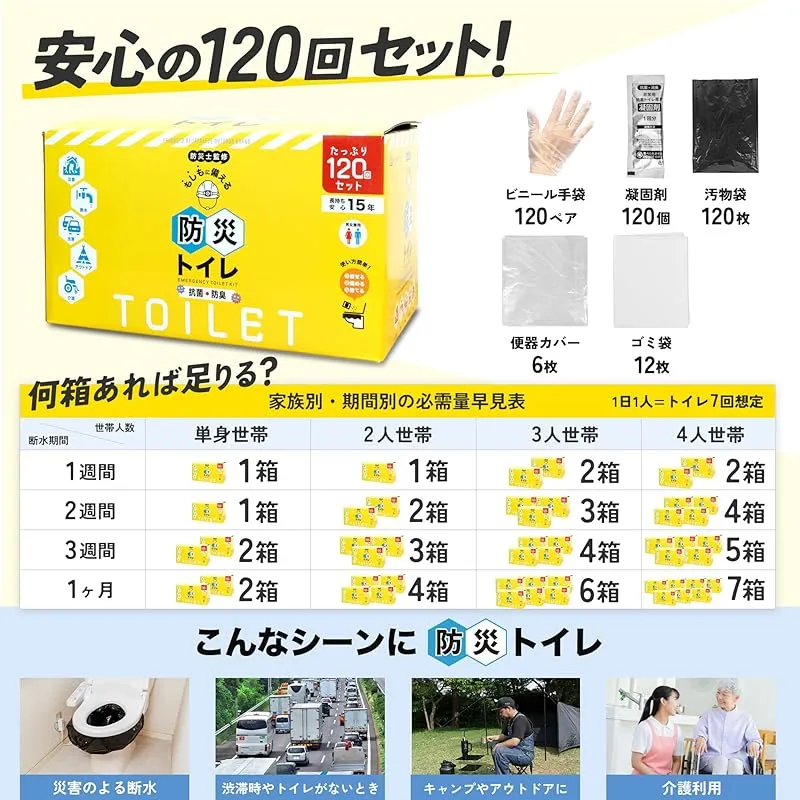 【商品説明】 災害時、ライフラインが止まってしまった際に備蓄しておくと役立つ「簡易トイレ」。 避難所生活で水や食料よりもまず必要になるのはトイレと言われています。 断水時には家庭のトイレにセットして使用可能。 安心の120回セットで4人家族でも5日程度の使用が可能です。 凝固剤の量は10gと多く、1回の使用であれば十分に吸収できます。 凝固剤を入れてから30秒程度で糞尿をしっかりと固められるので安心です。 120回分の汚物袋に加え、便器に装着するカバーが付いているため汚物袋がトイレに付かず衛生的。 汚物袋で便座を直接覆うことで直接お尻を便器に付けず用を足せます。 汚物袋は横幅が広いため、端同士を3?4回しっかり縛れて安心です。