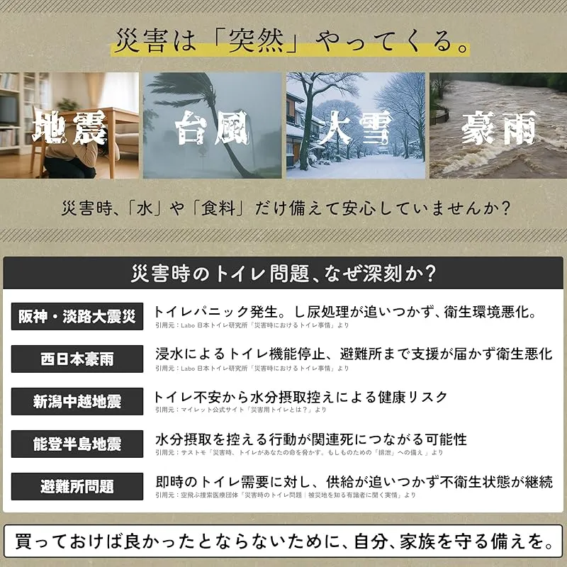 【自分や家族を守る防災グッズ】 避難所生活で水や食料よりもまず必要になるのはトイレ。 ・近くにトイレがない移動のストレス ・トイレが少なく常に多くの人が並んでいるストレス ・不衛生な環境下での利用 買っておけば良かったとならないために、自分、家族を守る備えとしてご利用ください。