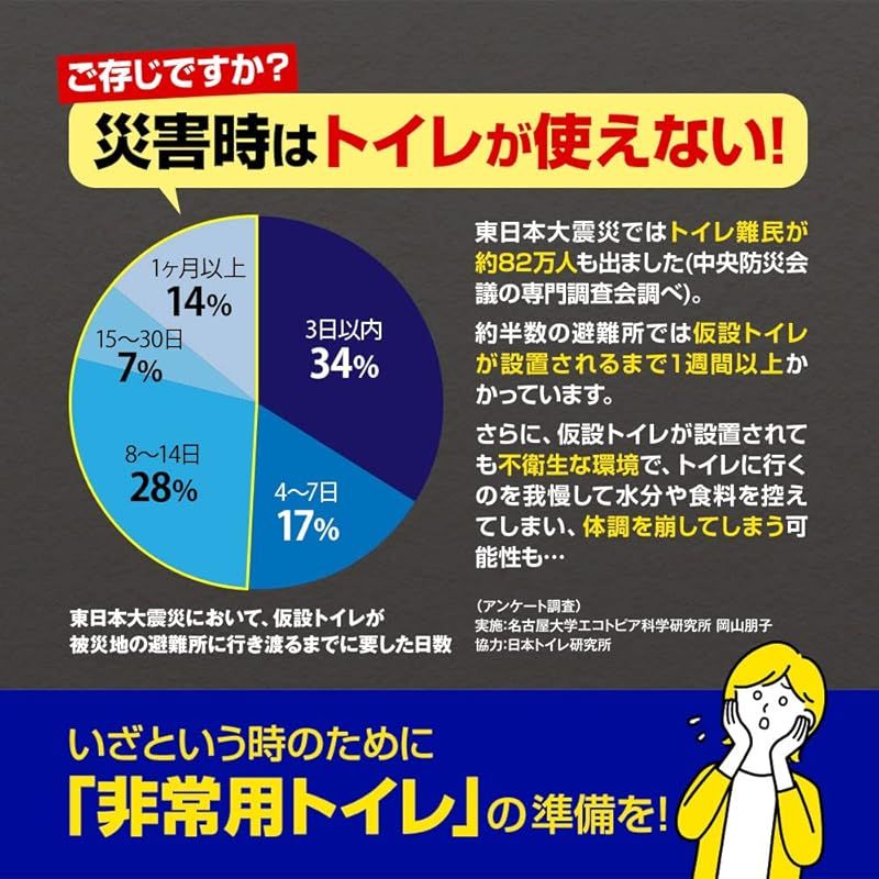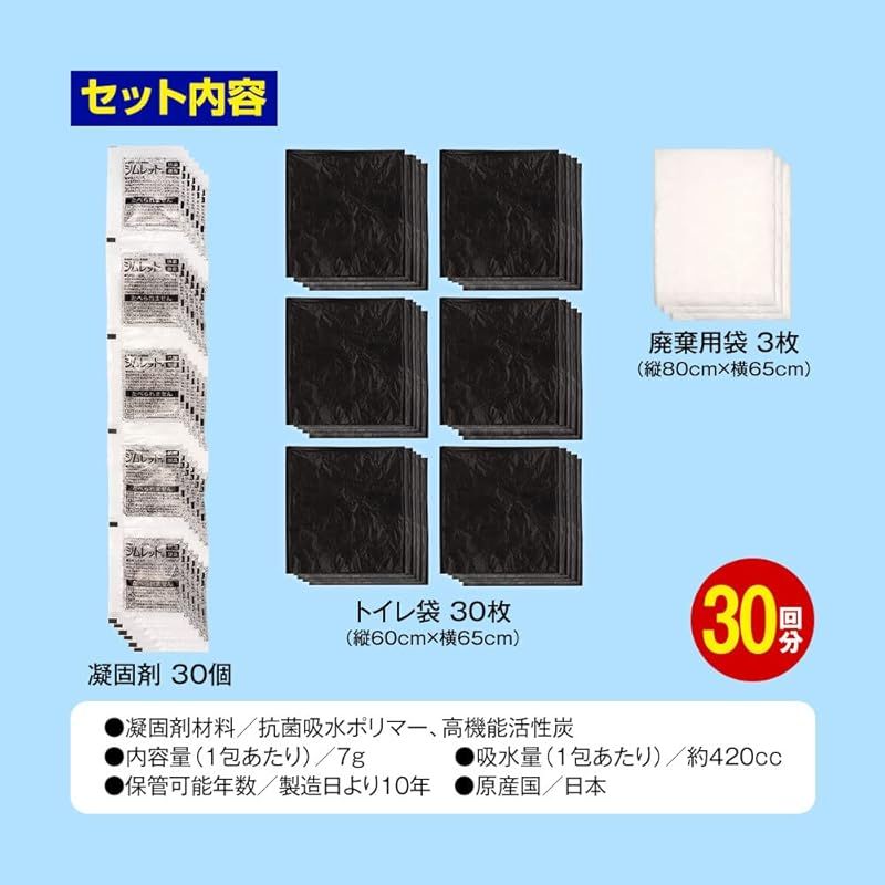 ●セット内容/凝固剤、トイレ袋(縦60cm×横65cm)(安心お手軽便座に使用可能)、廃棄用袋(縦80cm×横65cm)