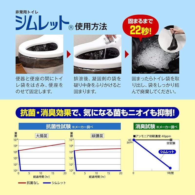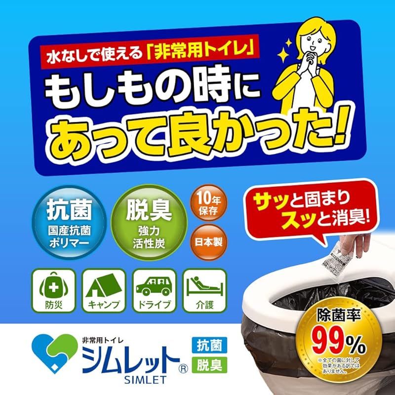 【シムレット10回分(凝固・消臭剤)付き】 届いたその日からすぐに使える「非常用トイレ シムレット」10回分をセット。排泄物を素早く固めてニオイも抑え、衛生的に処理できます。
