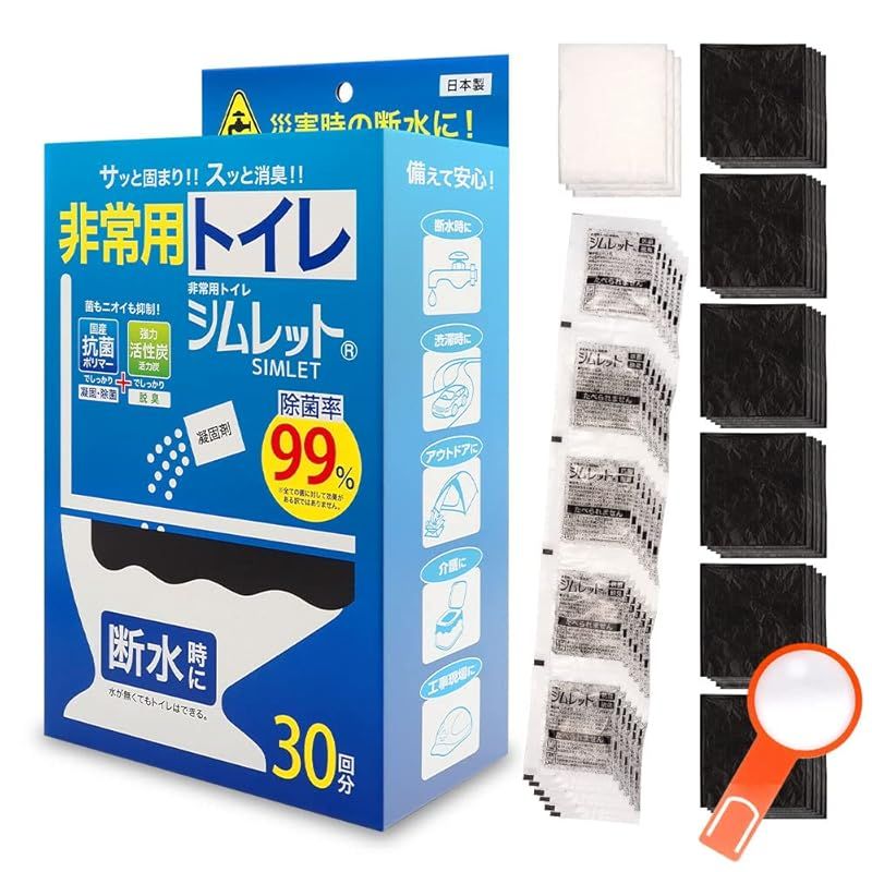【新品】 携帯トイレ シムレット 非常用 防災グッズ 抗菌 消臭 凝固剤10年保存 日本製 しおり型ルーペ付 (30回分)