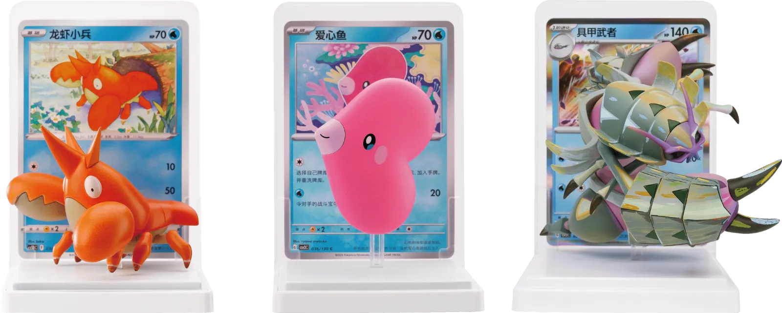 それぞれのフィギュアは、カードイラストの動き・表情・筆触・雰囲気まで忠実に再現しており、まるでイラストの世界から“歩き出した”ような立体感が魅力です。さらにフィギュアに対応したポケモンのキラカードも付属し、ディスプレイ映えも抜群です。