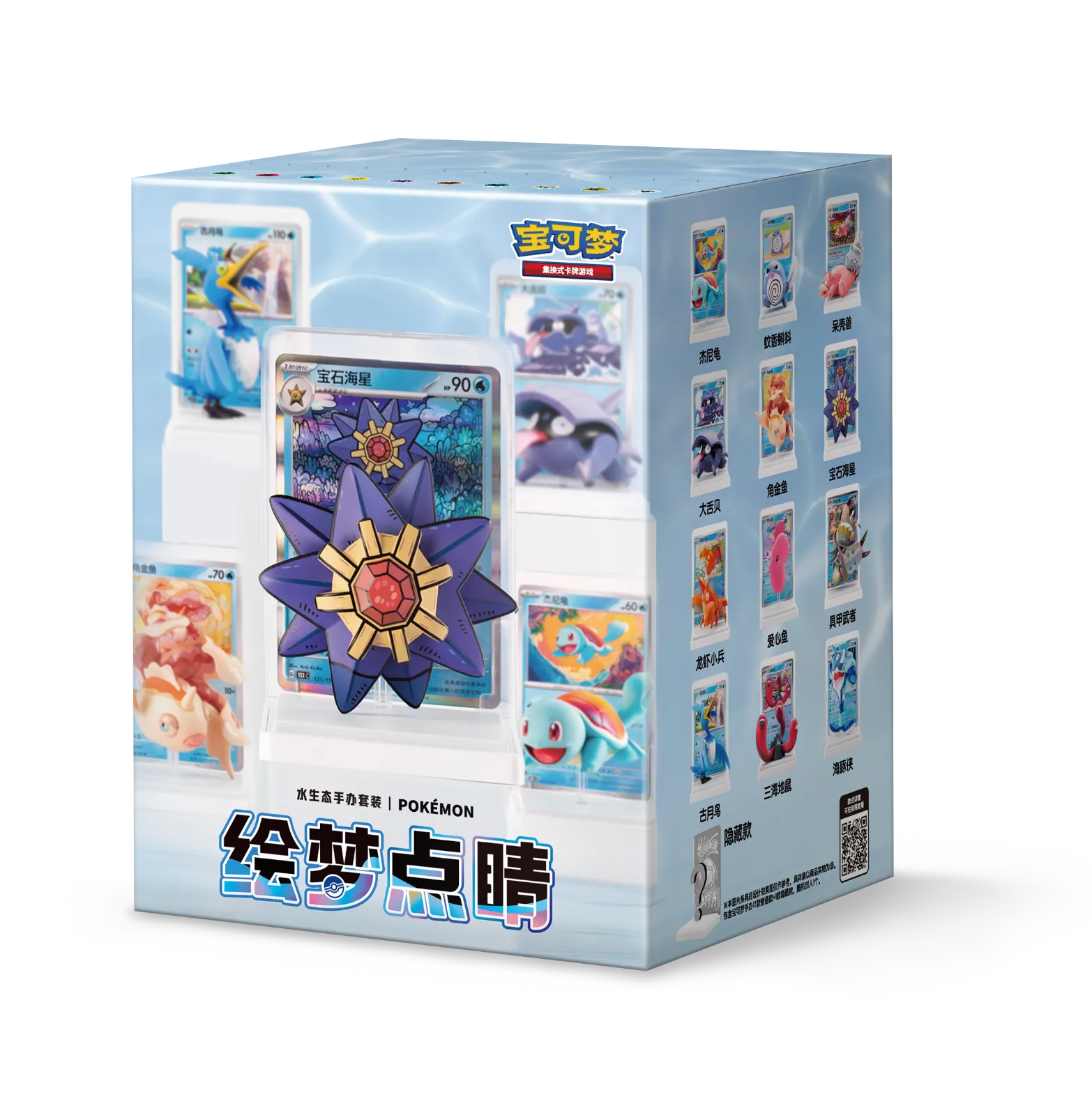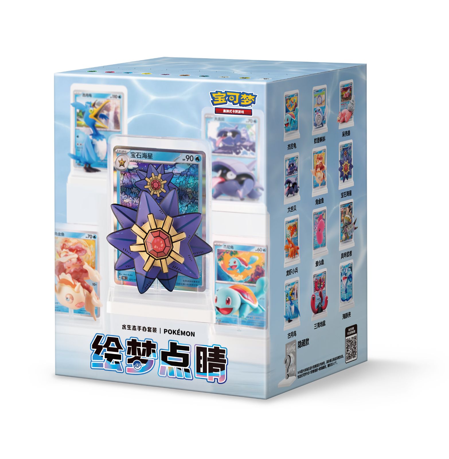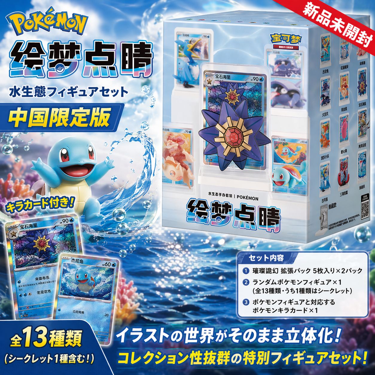 【商品詳細】 • 商品名: 絵夢点睛 水生態フィギュアセット • 内容物: 1. 璀璨詭幻 拡張パック 5枚入り×2パック 2. ランダムポケモンフィギュア ×1 (全13種類・うち1種類はシークレット) 3. ポケモンフィギュアと対応するポケモンキラカード ×1