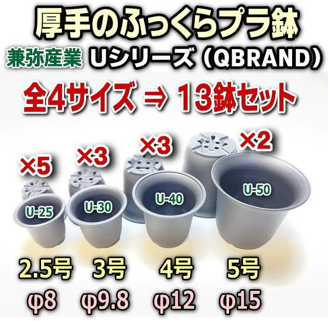 厚手のふっくらプラ鉢*カネヤ(兼弥産業)Uシリーズ(QBRAND)*全4サイズ:2.5号×5鉢*3号×3鉢*4号×3鉢*5号×2鉢の合計13鉢*多肉植物・塊根植物コーデックス・アガベ・サボテン・ハオルチア・アデニウム・パキポディウム・実生@フラワーショップ江口