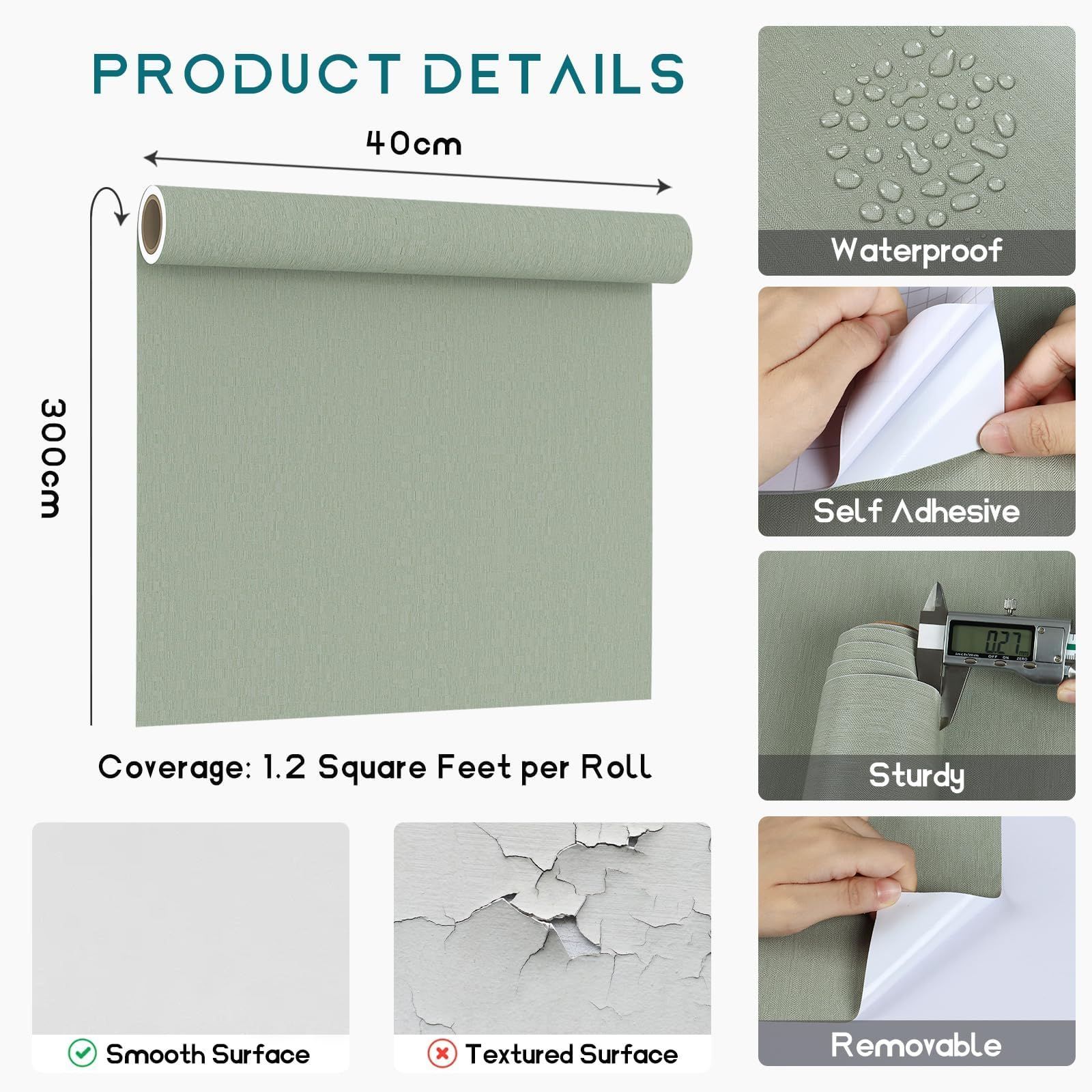 VEELIKE 織物調壁紙シール リメイクシート グリーン 灰緑色 耐熱 防水 厚手 貼りやすい 剥がせやすい ウォールステッカー 40X300cm インテリア リフォーム壁紙 カッティングシート 賃貸部屋向け 粘着剤付 剥がせるタイプ アクセント用 デコレーション 北欧・和風 キッチン トイレ 玄関 壁腰 扉 食器棚 天板 家具 DIY リフォーム専用