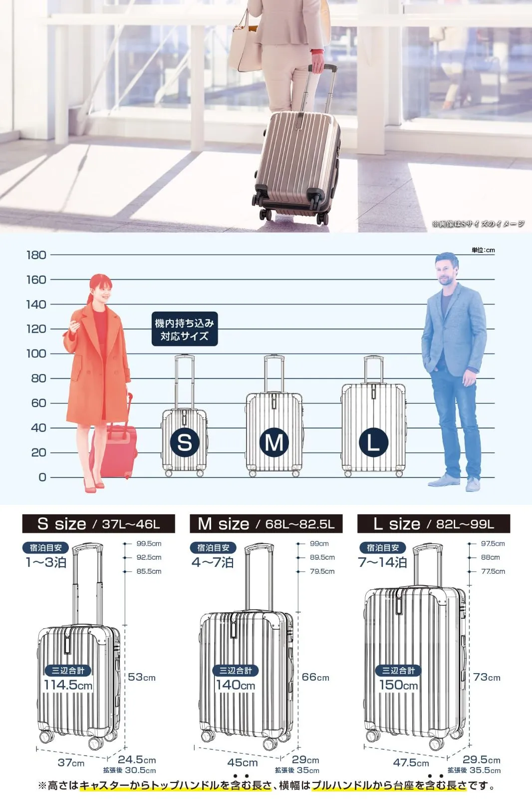 【 機内持ち込み対応サイズ 】Sサイズは機内持ち込み可能サイズ、3辺合計115cm以内に設計しています。詳しくは各旅行会社にお問い合わせ願います