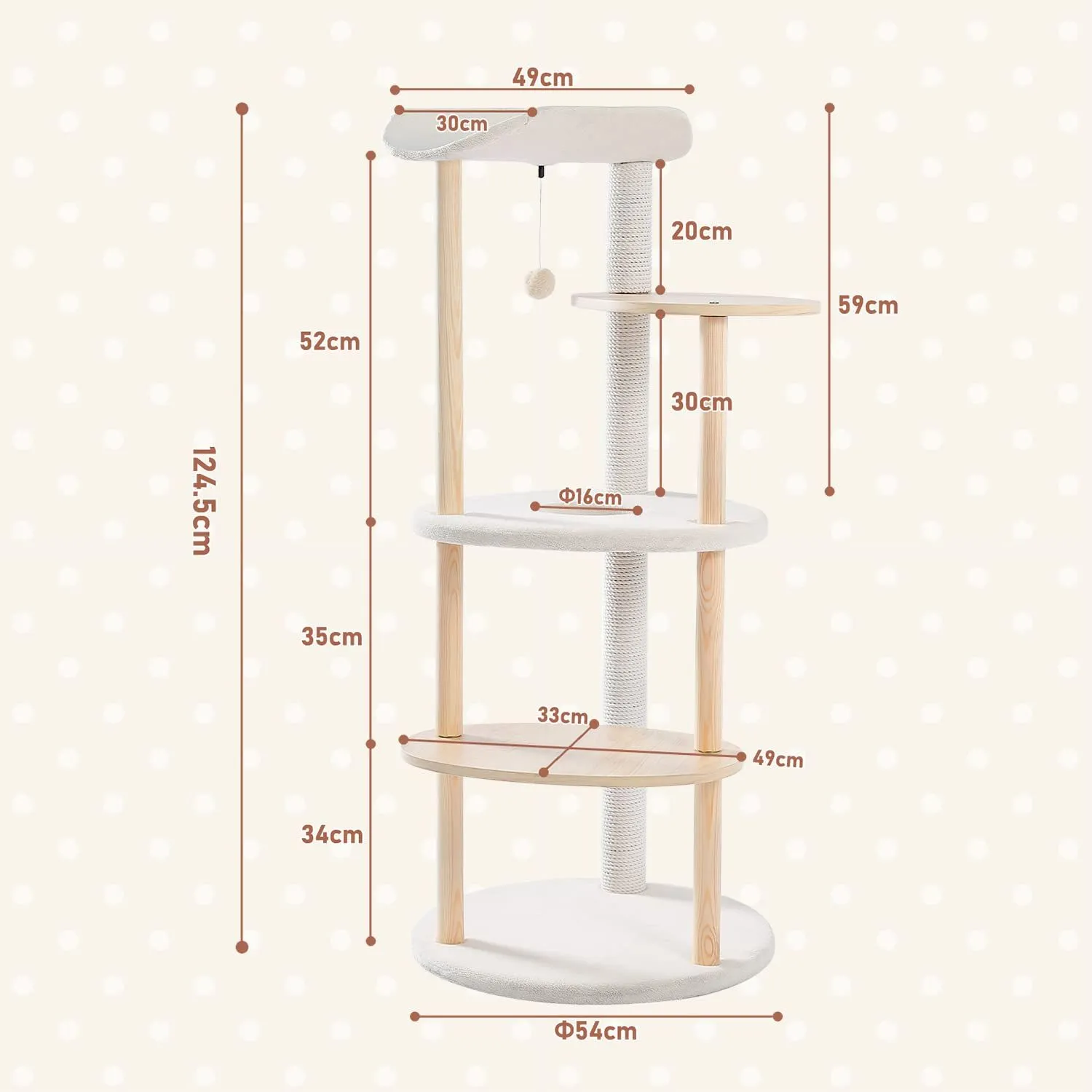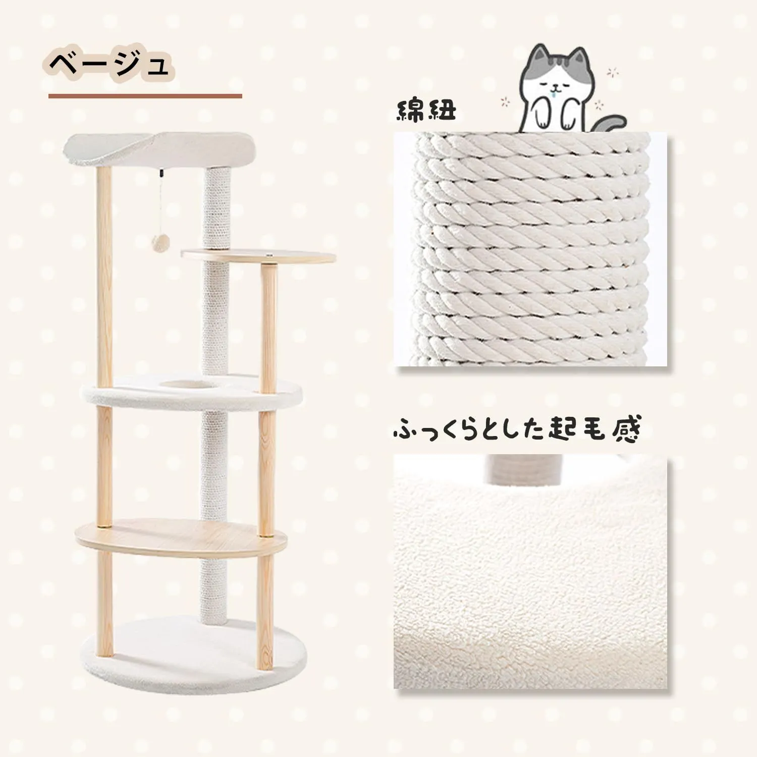 PETEPELA(ぺテぺラ) キャットタワー 木製 木目調 猫タワー スリム おしゃれ シンプル 爪研ぎ カーブ 運動不足解消 丸めな板 人気 インテリア - 高さ124.5cm ベージュ
