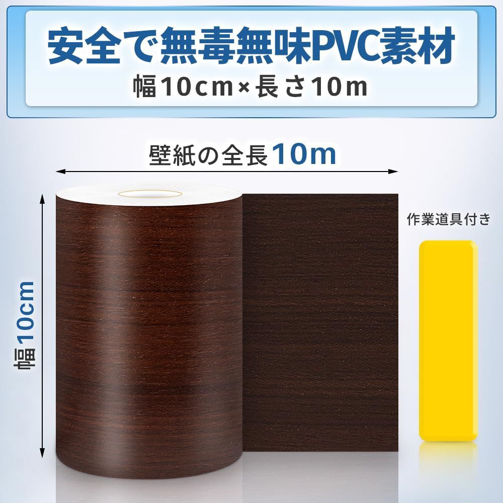 【数量限定】木目調テープ 強い粘着力 木口テープ 厚手 木目調シール 木目 貼って剥がせる 木目 壁紙シール リメイクシート 壁 長さ10m キッチン 幅10cm 台所 巾木テープ 窓枠用 茶色 シート マスキングテープ 防水(道具付き)