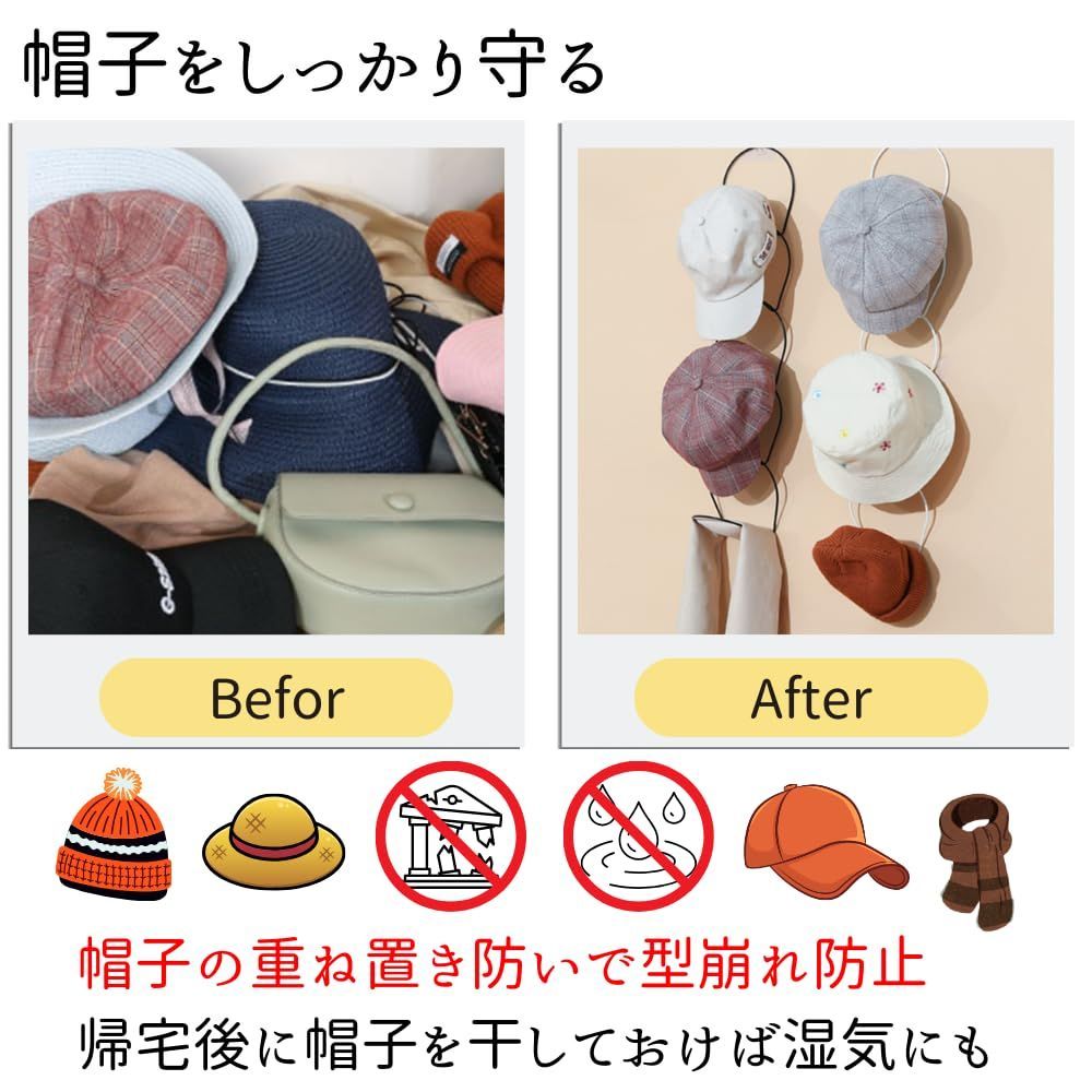 【帽子をしっかり守る】帽子の重ね置き防ぎ、型崩れから守ってくれる帽子掛け。帰宅後に帽子をフックかけて干しておけば湿気と気になる臭い対策にもバッチリ。大切なアイテムを大切に長く使いたい方にピッタリ。