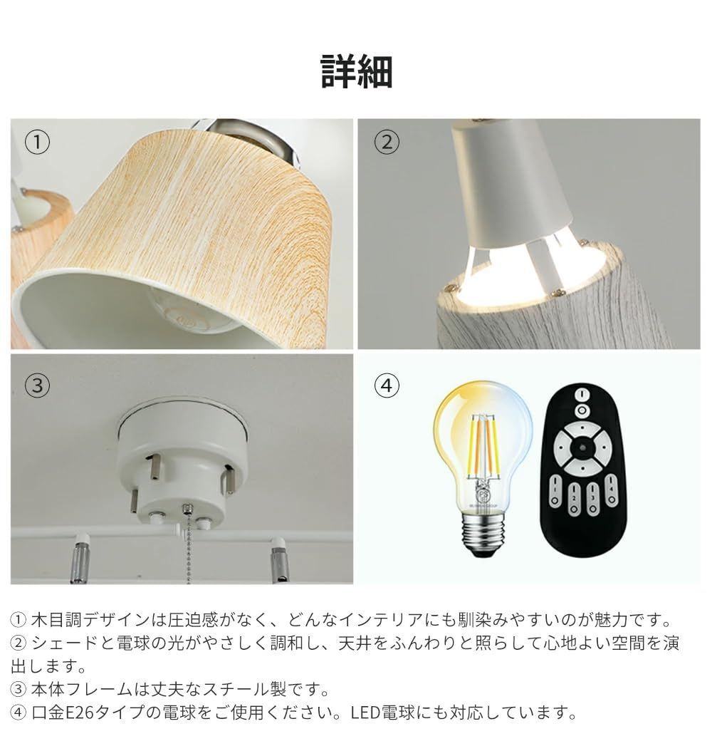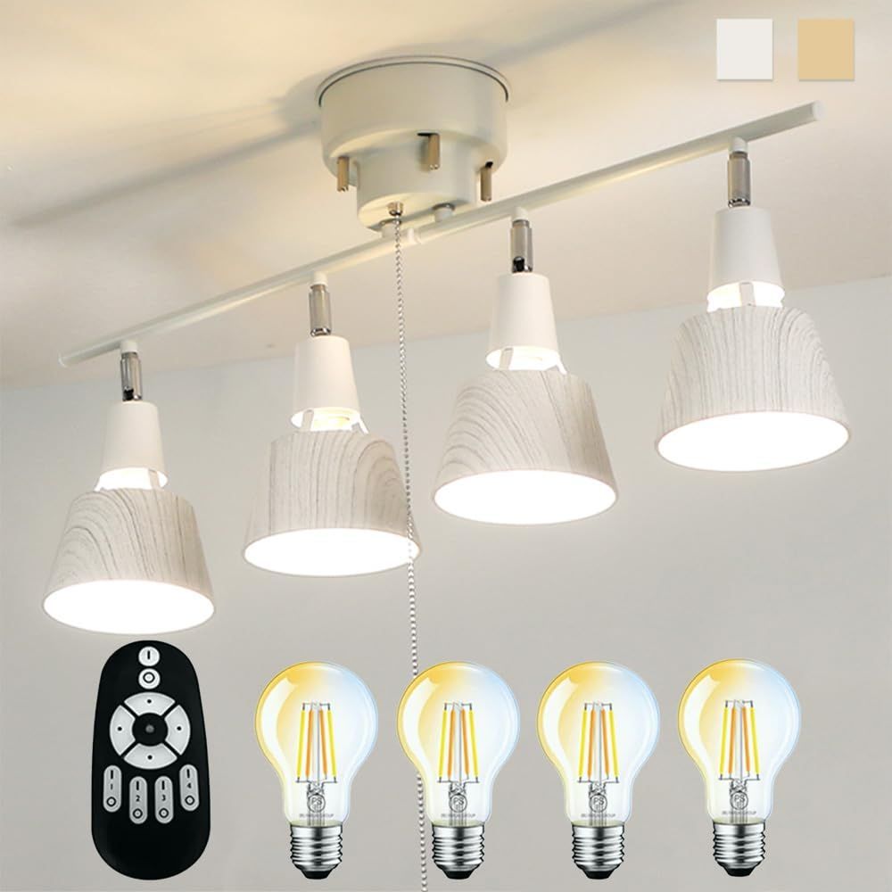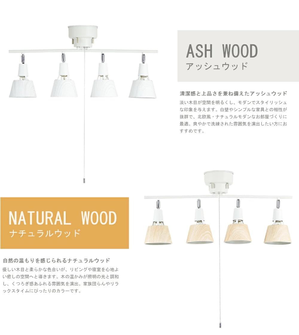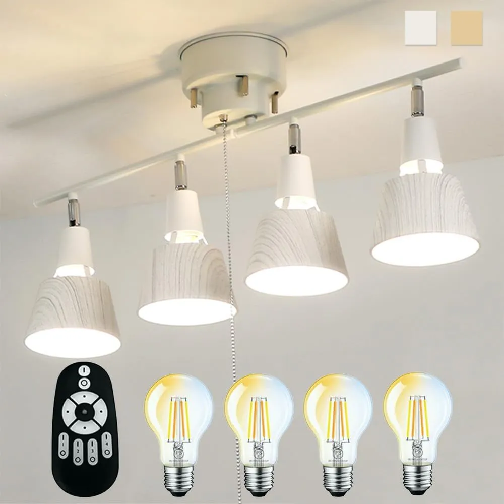 シーリングスポットライト 4灯 リモコン付き シーリングライト ライト おしゃれ 天井 照明器具 LED 北欧デザイン 4灯スポットライト LED電球60W形付き 木目 角度調節 調光調色 6畳 8畳 10畳対応 簡単取付 E26 リビング照明 ダイニング 寝室 和室 洋室 間接照明 (アッシュウッド, 調色調色電球4個セット+リモコン付き)