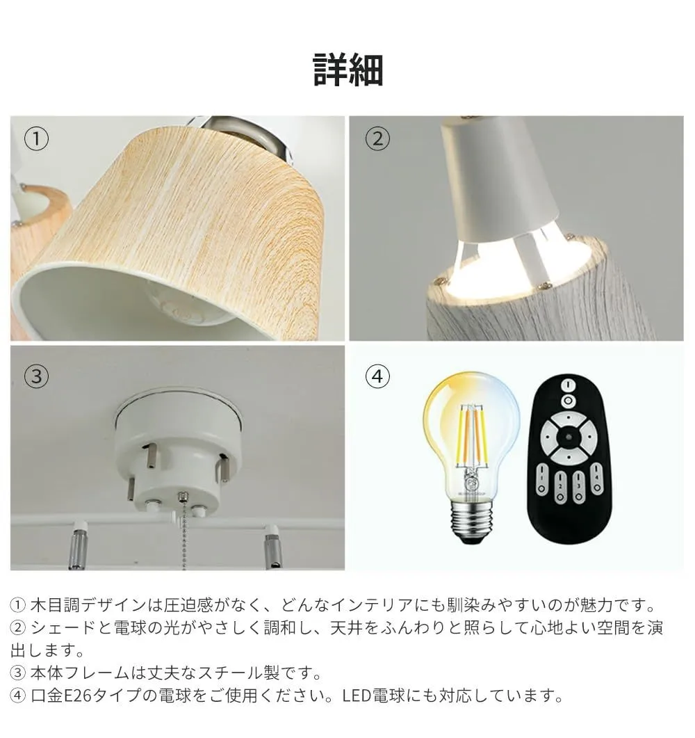 【人気商品】4灯 リモコン付き シーリングライト ライト おしゃれ 天井 照明器具 LED 北欧デザイン 4灯スポットライト LED電球60W形付き シーリングスポットライト 木目 角度調節 調光調色 6畳 8畳 10畳対応 簡単取付 E26 リビング照明 ダ