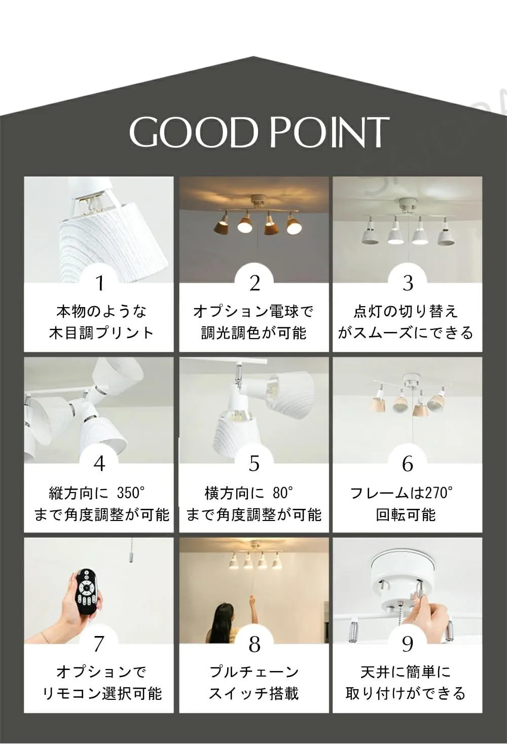 【プロのような照明コントロールを実現】各 シーリングスポットライト は独立して最大350°回転・80°傾斜可能。フレームも270°回転するため、観葉植物、ダイニングテーブル、読書スペースなど、お好みの場所をピンポイントで照らせます。光でお部屋のレイアウトに動きと立体感を与え、こだわりの空間づくりを叶える 天井 照明です。