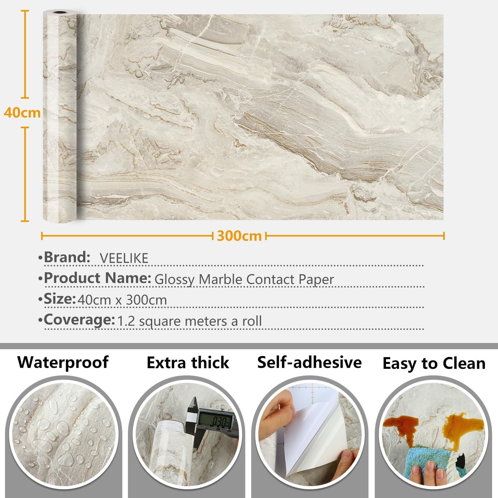 VEELIKE 大理石シート 壁紙シール ベージュ カッティングシート ツルツル光沢感 リメイクシート インテリア 張り替えシート ふすまに貼れる壁紙クロス リフォームシート キッチンシート リフォームシート 石目ウォールステッカー 剥がせる 厚手 賃貸DIYの神器 模様替え 家具再生 補修 手入れ簡単 耐摩擦 撥水 防水 油汚れに強い シンク トイレ 棚 マーブル調 40x300cm