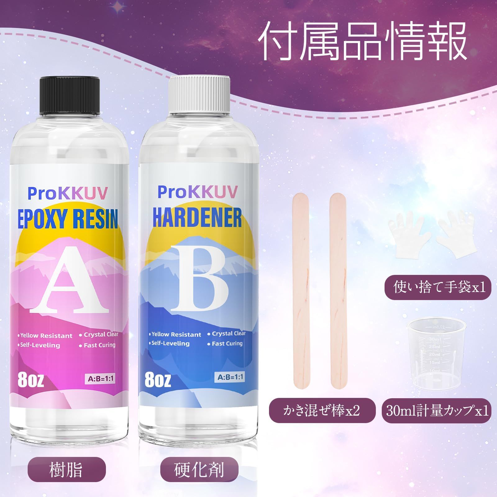 【大容量 2液性レジン液】2液性エポキシ樹脂で、容量は16oz(273g+244g)です。混合比は1:1(体積比)で、DIYをより楽しくこれだけでキーホルダーが簡単にできます。ご注意ください:この商品はUVレジンではなく、エポキシ樹脂のレジンです。ProKKUVは私たちのブランドです。