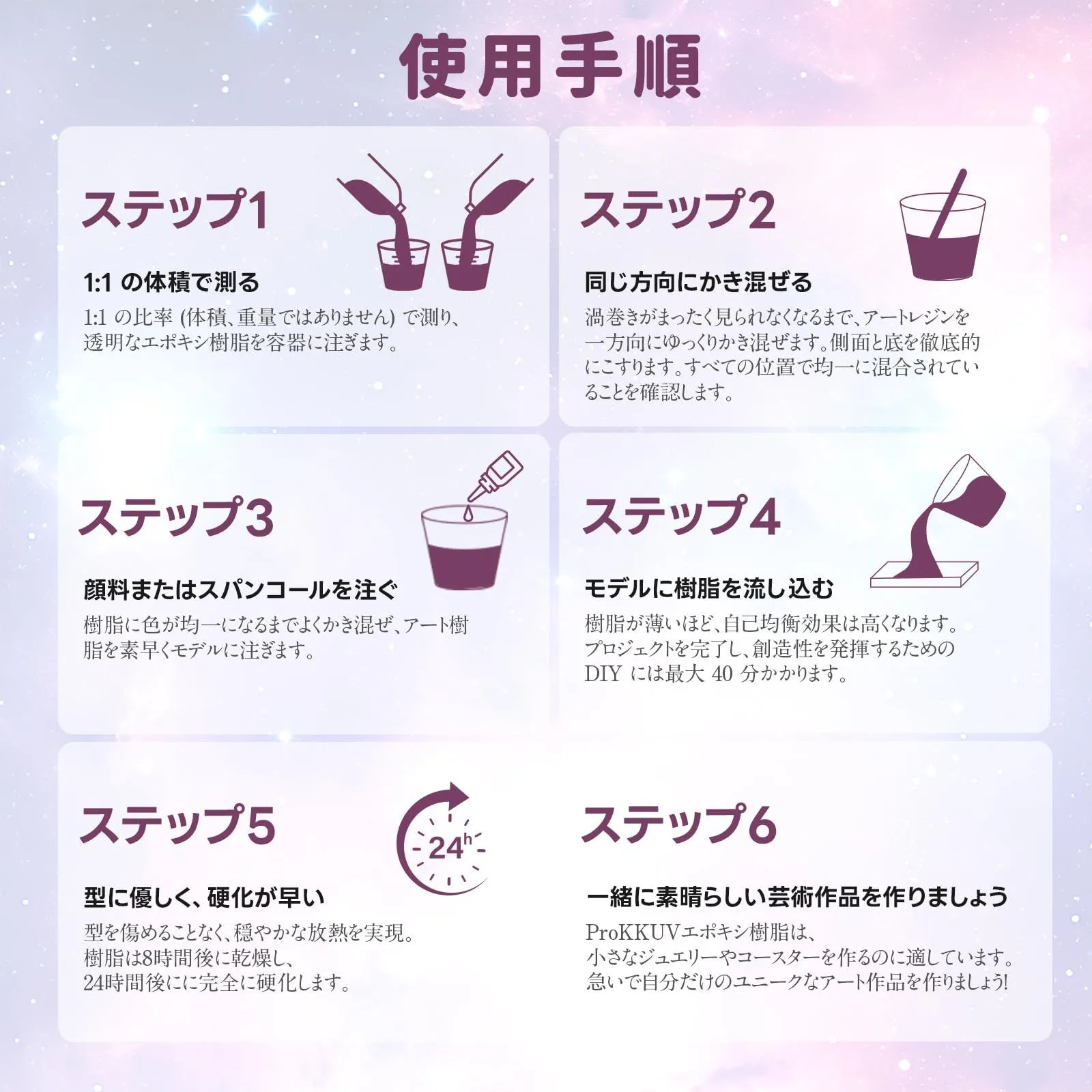 【レジン液 セット-幅広い用途】ProKKUVエポキシ樹脂はアートジュエリーの制作に最適です。ピアスやネックレス、絵画、人形作り、工芸品の装飾、コーティングなどのアクセサリー作りに使用できます。自分の手作り品を集めるだけでなく、大切な人への贈り物としてもおすすめです。