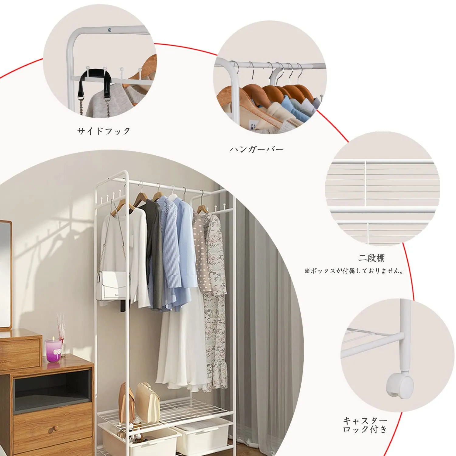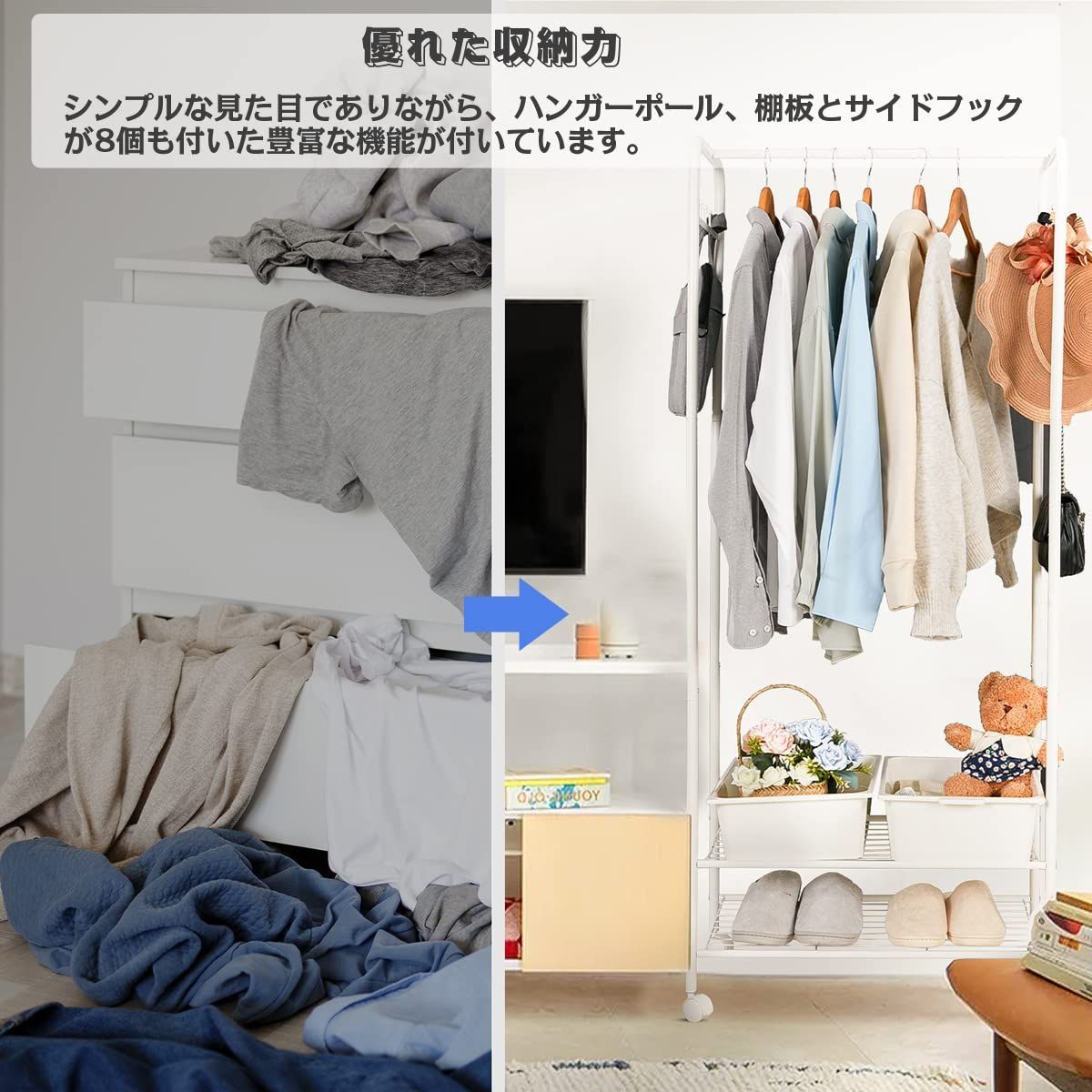 【優れた収納力】シンプルな見た目でありながら、ハンガーポール、棚板とサイドフックが8個も付いた豊富な機能が付いています。洋服、バッグ、靴、帽子、小物など様々な物をすっきり収納できます。