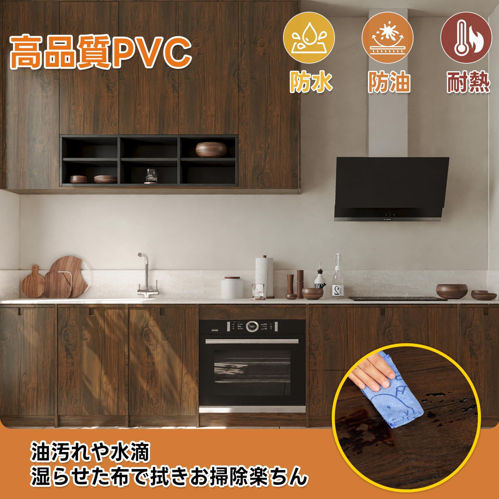 お手入れの簡単さ:PVC(ポリ塩化ビニル)製の壁紙シールは、耐熱性・耐油性・耐水性に優れています。キッチンの油汚れやお手洗いの水滴は、湿らせた布で軽く拭くだけで簡単に落とせます。注意:防水仕様ですが、長時間の水没や直接水をかけるようなご使用はお控えください。耐油性・耐熱性は備えておりますが、耐火性能はありません。ストーブやコンロなどの火気からは十分な距離を保ってご使用ください