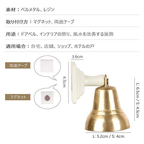 仕様:スタイル・サイズ:L マグネット、口径5.2cm、高さ6.5cm、ベルラック3.6 * 4.5cm。シンプルなドアベル、ベル表面はつや消しです。真鍮よりも純粋で耐食性のあるベルメタルで作られています。ベル本体は滑らかなラインと自然なアーチ形を持っています。ベルは滑らかで繊細な白いラックと組み合わせて、さまざまなインテリアに合い、芸術感があります。真っ白な色は人々を安心させ、イライラを和らげ、落ち着かせます。鈴の音が澄んでいて、音はサクサクしていて心も心地よいです。
