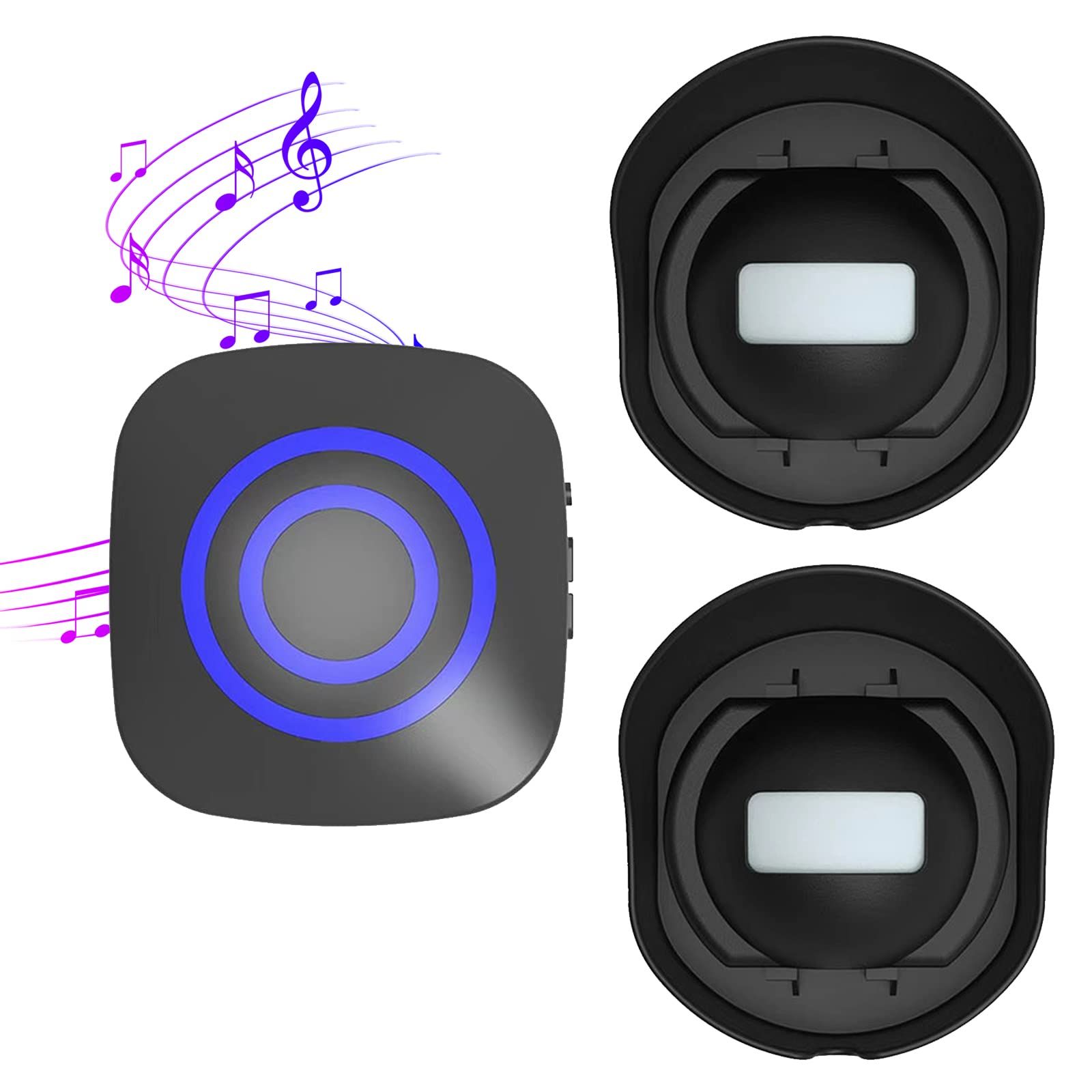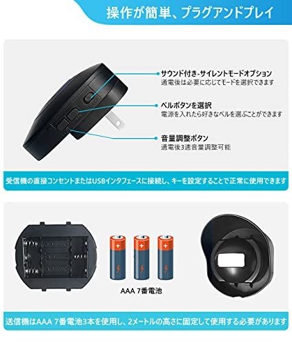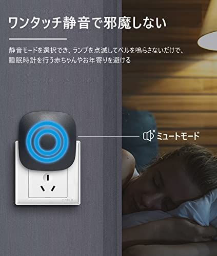 【38曲、音量調整】このワイヤレスチャイムは 38曲があり、3つのレベル(高、中、低)の音量調整、側面ボタンのタッチから調整可能です。LED指示灯と音の有無にかかわらず設定可能(サウンド:サウンドインジケーターサイレント:インジケーター)。