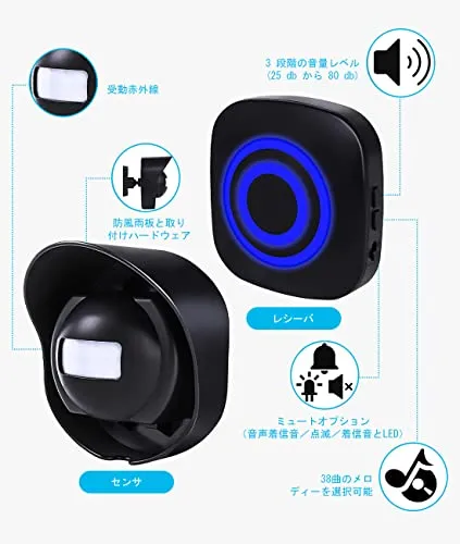 ワイヤレスチャイム ドアベル センサーチャイム 人感 赤外線センサー 人感センサー チャイム 店舗用 人感センサー チャイム 屋外 防水 アナンシエーター 防犯対策 干渉なし IP65防水 選べる38曲 3段階音量調整 店舗向け 家庭向け プローブ2 国内発送