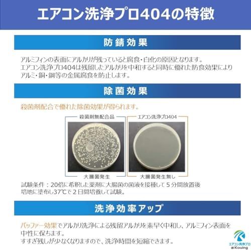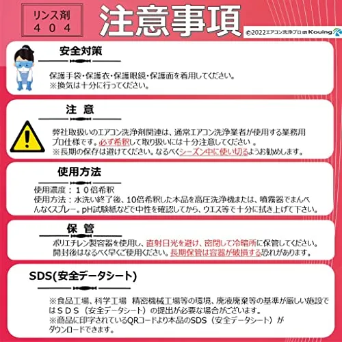 【 4kg 】 用途:アルミフィン フィルター洗浄後の 除菌 防錆 中和仕上げ 特長: *防錆効果*アルミの腐食(白化)を防止します。アルミフィンの表面にアルカリが残っていると腐食・白化の原因となります。優れた防錆効果によりアルミ、銅、鋼等の金属腐食を防止します 。 *除菌効果*殺菌剤配合で優れた殺菌効果が得られます。カビ・バクテリアの発生を抑制します。 *バッファー効果*バッファー効果でアルカリ洗剤による残留アルカリを素早く中和しアルミフィン表面を中性に保ちます。すすぎ残しが少なくなりますので、洗浄時間を短縮できます。 性状:中性の液体 PH:5.58.0 荷姿:1kgポリ容器・改ざん防止キャップ仕様 使用推奨方法は2通り 1(エアコン洗浄プロ505での洗浄後、水洗いの際に20倍希釈した本品を高圧洗浄機で水洗いと同様に使用オススメ) 2(エアコン洗浄プロ505での洗浄後、水洗いを十分に行い、そのあとに10倍希釈した本品を噴霧器でまんべんなくスプレー) ※作業後は洗浄剤の残留がないか、pH試験紙等で中性であることを確認してください。 注意 ※弊社取扱いのエアコン洗浄剤関連は通常エアコン洗浄業者が使用するプロ仕様の業務用商品です。必ず希釈して取り扱いには十分注意してください ※長期の保存は避けてください。なるべくシーズン中に使い切るようお勧めします *SDS(安全データシート)について 食品工場、科学工場 精密機械工場等の廃液廃棄等の基準が厳しい施設では SDS(安全データシート)の提出が必要な場合がございます。 弊社ホームページにてダウンロードできます。
