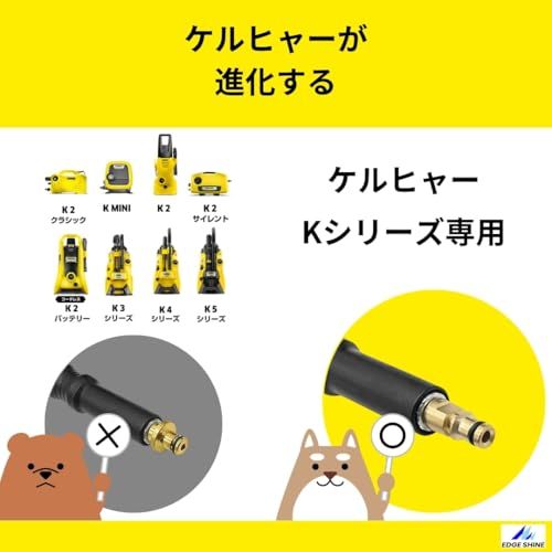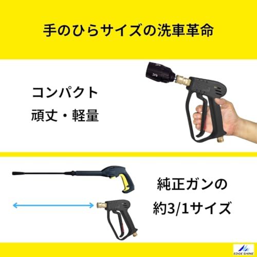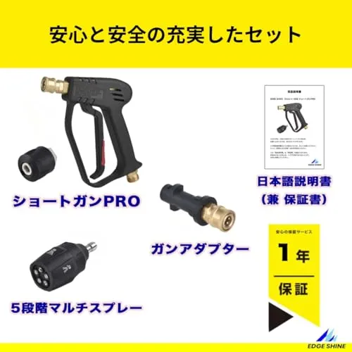 【製品仕様】 製品名: EDGE SHINE ショートガン PRO & 5in1マルチノズル セット 対応メーカー: ケルヒャー(KARCHER)家庭用高圧洗浄機 主な適合モデル: K2、K3、K4、K5、K Mini、JTKサイレントシリーズ 材質: エンジニアリングプラスチック、真鍮、ステンレス 付属品: ショートガンPRO本体、5in1マルチスプレーノズル、ガンアダプター