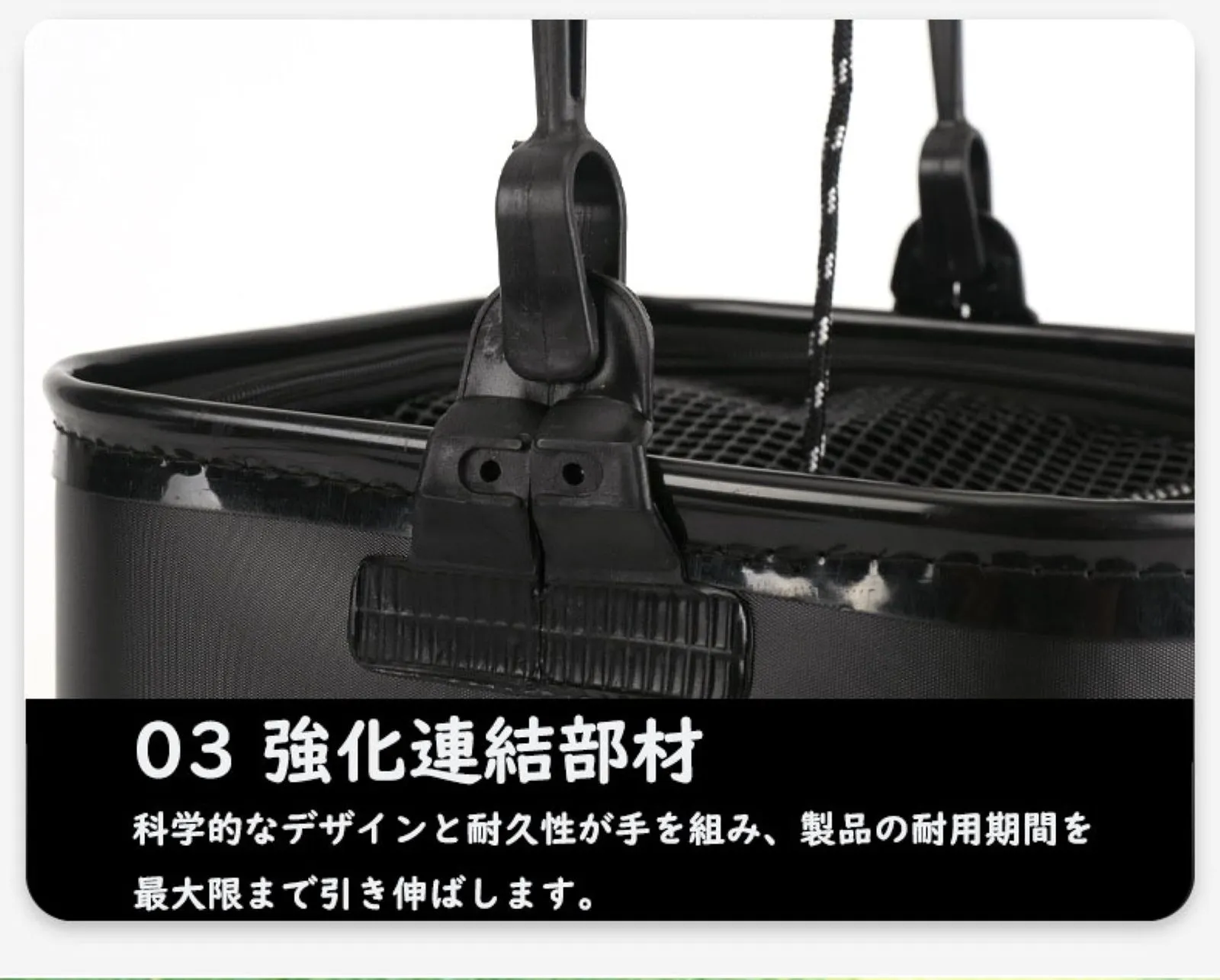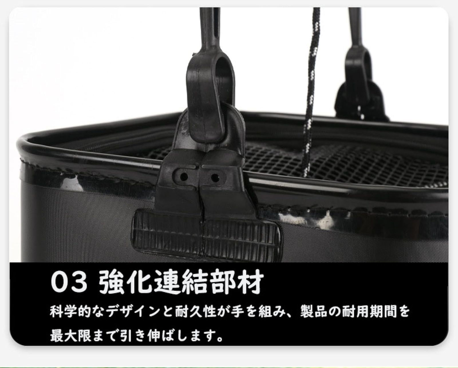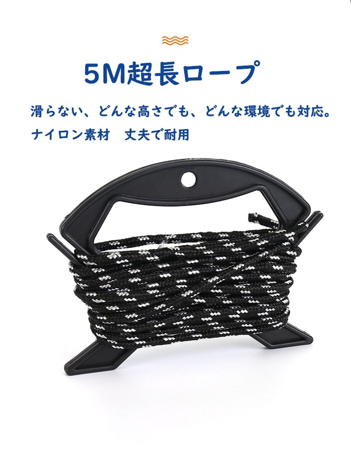 【耐久性の高いコブ付きロープ】直径4mmで従来のロープよりも1.3倍太く、長さ5mのロープを採用しました。水くみ作業をサポートするために、防波堤や一直線の場所でも使用できます。