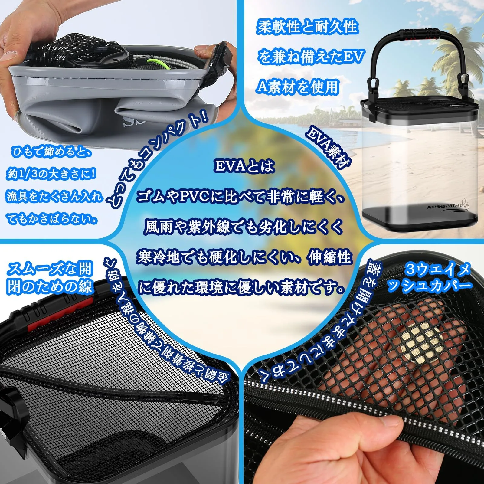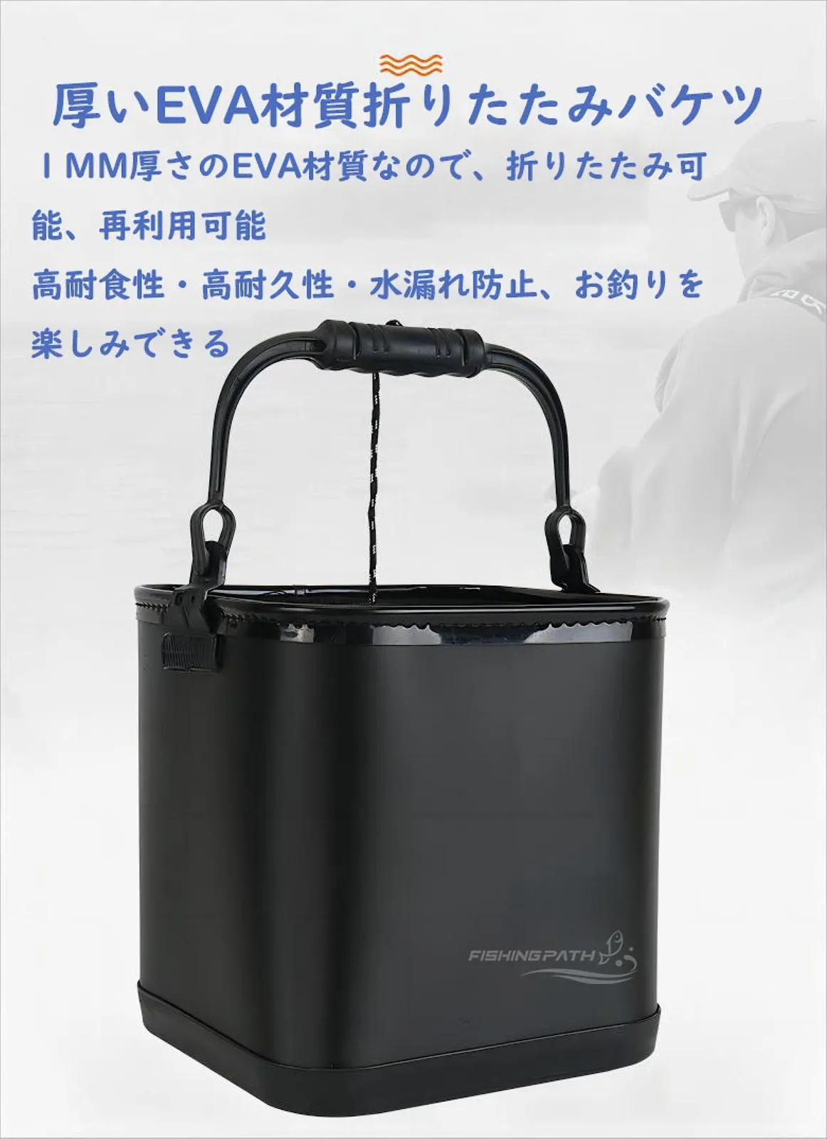 【コンパクト収納のための簡単折りたたみ】耐久性と柔軟性に優れたEVA素材を使用し、一般的な水くみバケツのように「硬すぎて折りたたむのが大変」という問題はありません。折りたたむと使用時の1/4程度の薄さになり、多くの道具を持ち込んだ釣行でも邪魔になりません。