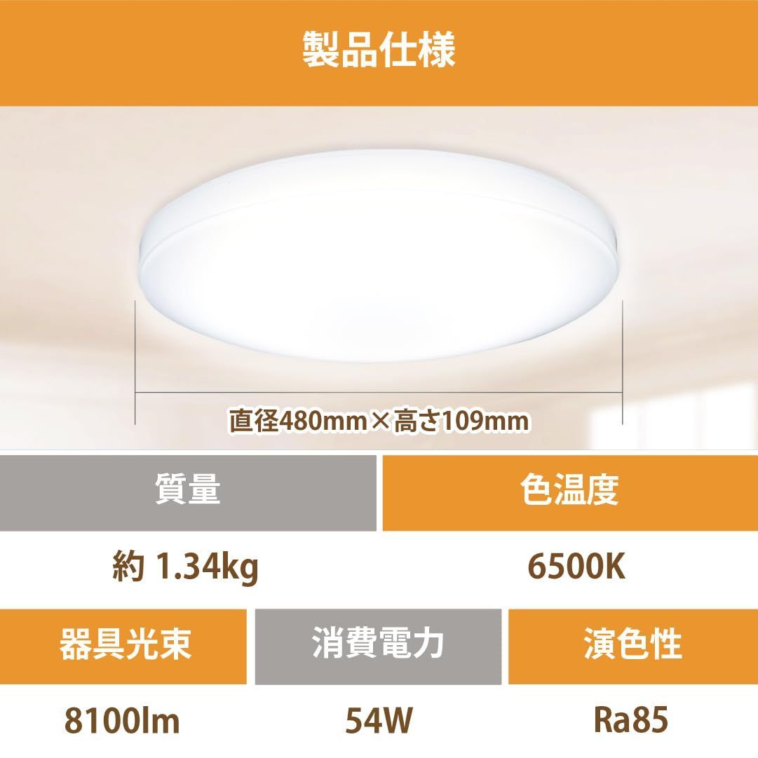 ?定格消費電力:18畳用:54W、照明器具別全光束:18畳用:8,100lm、本体サイズ:φ480?H109(スポンジ無し)